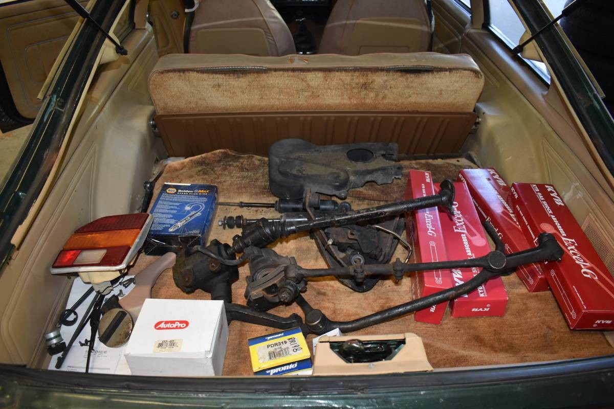 The exterior of the vehicle features untouched original paint with patina in various areas. However, there are a variety of spare body parts included with the vehicle’s sale, such as an extra hood, front and rear bumpers, front grille, front fenders, a hatchback lid, and even more.