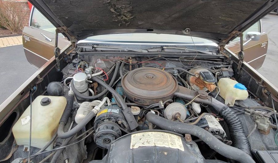 Under the hood resides a 260 cubic-inch V8 which we’re told runs perfectly, although the engine compartment is dirty. I’d rather see one like this than after it’s been pressure washed and you don’t know what it looked like before. With an automatic transmission, this certainly is more of a “cruiser” since acceleration is not likely very brisk, especially when towing something as this wagon has a trailer hitch. The factory A/C has been retrofitted to R134A standards for the coldest of cold air. If you’re looking for a second vehicle or one for road trips, this Oldsmobile would be way cooler than most of today’s SUVs!