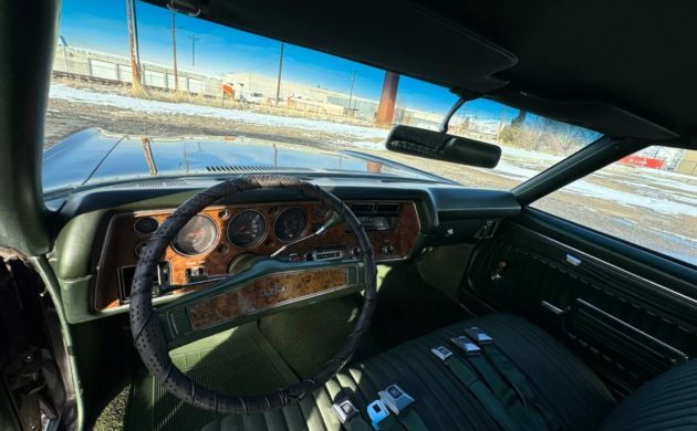 The first owner provided a classy contrast to the dark exterior by ordering the car with its interior trimmed in Green. Knit cloth covers the seat faces, with the remaining upholstered surfaces wearing vinyl in the same color. There is only one glaring issue with the interior, and it is apparent before you open the driver’s door. The upper seat on that side is physically damaged, and I believe the problem is beyond repair. The winning bidder could fit a slipcover to hide the problem, or they could splash around $450 on a replacement front cover in the correct color and material. Otherwise, there is little inside this classic warranting criticism. The back seat and headliner are nice, the woodgrain trim hasn’t deteriorated, and the dashpad and carpet haven’t succumbed to UV exposure. The seller recharged the air conditioning to blow ice-cold, while the buyer will also receive a power seat, tilt wheel, remote driver’s mirror, and an AM radio/stereo tape player.