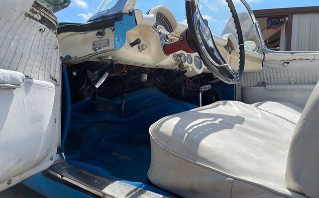 I like first generation/body style C1s, as I have helped restore one about 50 years ago. I hate the blue color AND any car with wire headlamp covers needs wire wheels. (JMHO) Also, kind of different to see a vintage carb. on a “newish” intake manifold. What a shame to see the interior in this condition. Having see many of the pre-1956 cars that have actually sat out in the weather with no “top” protection with interiors in much better condition. You have to wonder the history of this car.