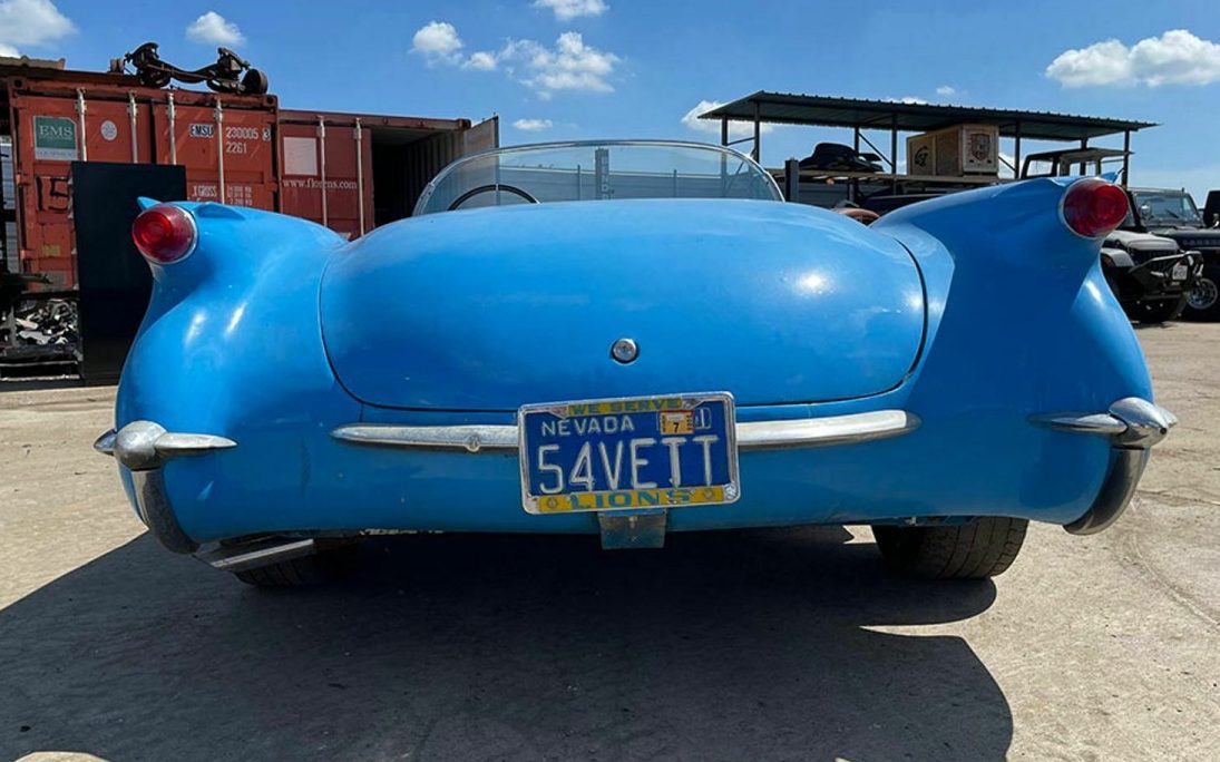 No doubt about it, the color caught my attention, I can be a real sap for the right hue, well applied. Corvette’s first year, 1953, offered an exciting choice of colors, providing that Polo White was your preference. Things became a bit more technicolor in ’54 with Pennant Blue and Sportsman Red joining the color wheel. There were even a few black with red interior examples rounding out the palette. And it’s a sure bet that the electric blue finish of this ’54 will never be mistaken for Pennant Blue. What exact shade it is, is not disclosed but it makes a visual statement at a distance. The paint appears to have been well applied and the underlying fiberglass reveals no signs of distress though there are some noted chips here and there. This is a bit of a custom Corvette as some of the trim and badging have been removed as has the rear license plate alcove. What trim is still in place looks OK, just a bit tired. Rounding out the exterior are ’70s vintage Western chrome steel wheels and a scoop of some sort that has been plopped onto the hood.