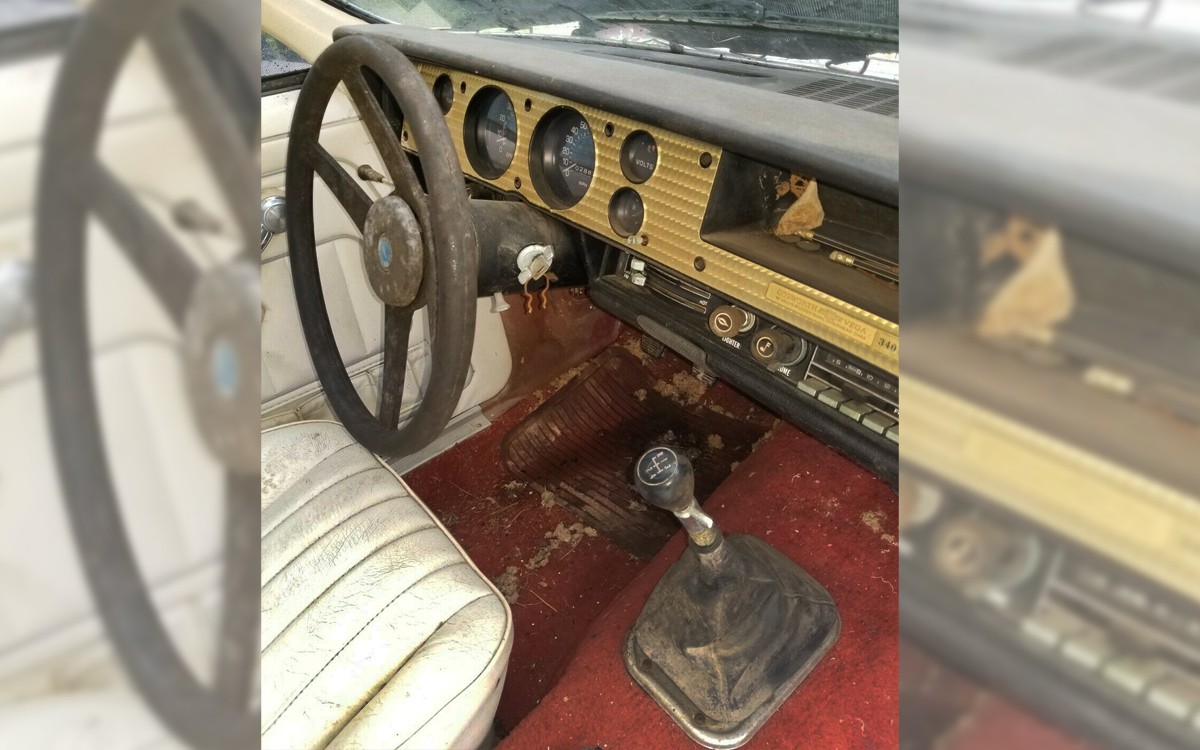 The interior could easily be cleaned up and would look 90% like new I bet. The seats and door panels in white are eye-catching and unusual and they look fantastic, just a little dirty. The optional houndstooth fabric inserts would have been a nice touch. It may need new carpets, they look pretty faded, especially in the cargo area. This one doesn’t have the optional 5-speed manual, unfortunately, but a 4-speed would work nicely.
