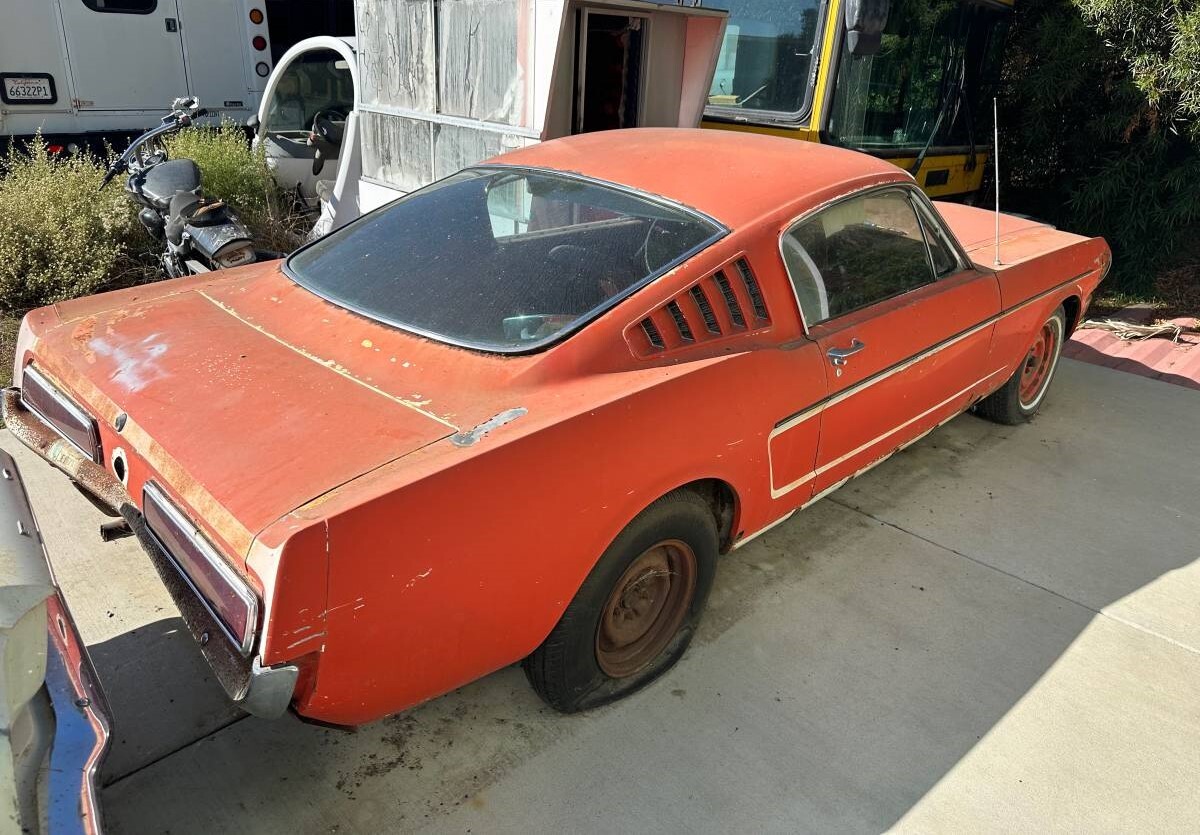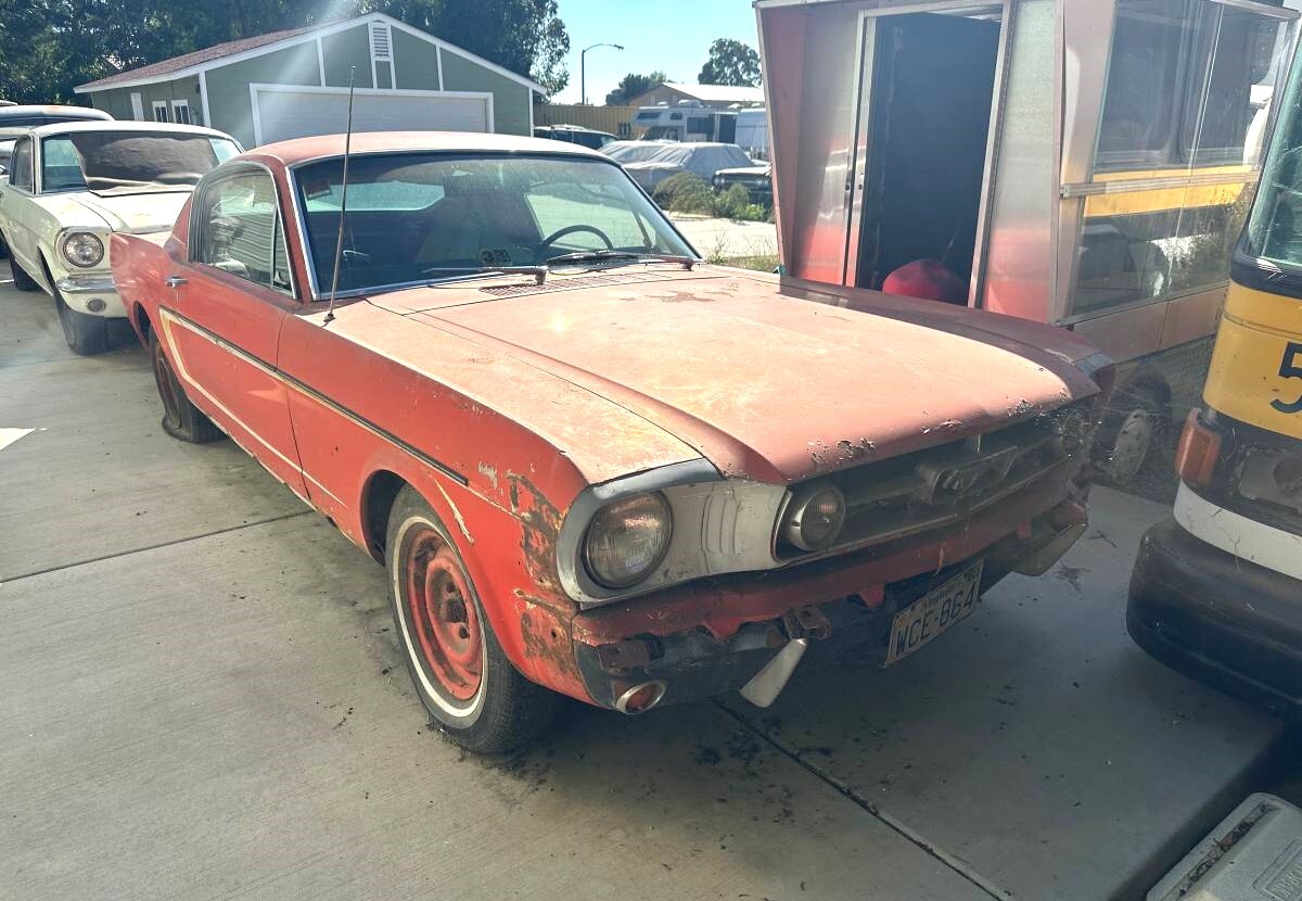 From 1964-66, Ford kept its factories working overtime to produce the hot new Falcon-based Mustang. 1.3 million copies emerged over two full model years, a feat that Detroit has seldom duplicated. Nearly 560,000 units were produced for 1965 alone of which 77,000 would be the sportier new fastback edition. This one would leave the assembly line finished in Wimbledon White, but the color would later be changed to red, which has faded. But what’s with the extra-wide tailights?