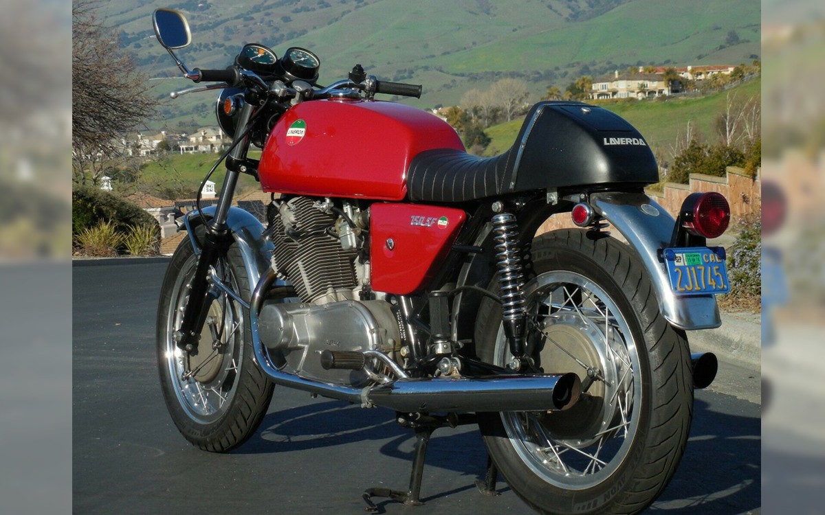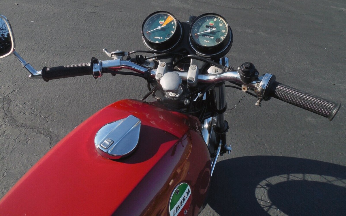 The seller says that this is an original, spotless, and gorgeous Laverda 750 SF and I agree, at least on the last two points. I/we can’t know for sure whether it’s all original but we have no reason to doubt the seller’s word. This bike was last registered in the fall of 1978 and had been stored in a heated warehouse, or house, in Berkely, CA for thirty years before the current seller bought it eight years ago. They have done a lot of maintenance including adding new tires, handlebar grips, fuel lines, a new battery, etc.