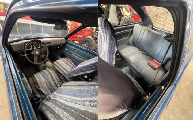 The body and blue paint look fine, as does part of the interior. But aftermarket discount store slip covers suggest the bucket seats could use a refresh. New parts include the fuel system (gas tank, carburetor, and fuel pump?) and new CA smog devices. Also, the brakes and tires have been replaced. Little else is said about the Chevette, so we must assume that the usual inspection will be needed before sealing the deal.
