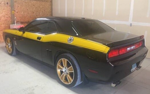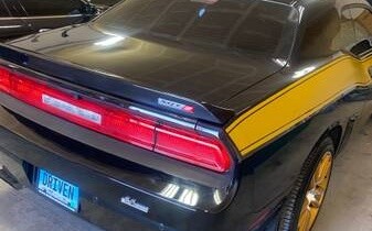 That No. 3 of 100 produced 50th anniversary Mr. Norm Dodge Challenger yiou are viewing and speaking of belongs to me. Gorgeous car! As it is a 2013 and with only about 24,000 miles on the clock, they don’t get much closer to new than this. The vehicle has vinyl graphics from 2013 ad the graphics are beginning to just peel off. A ladder fell into the hood inside my shop in Rapid City, South Dakota. It’s a very minor ding but an imperfection nonetheless. So Friday the original vinyl graphics are coming off of this vehicle. The hood ding will be properly repaired and then new vinyl graphics are going on the vehicle.This vehicle is so new it doesn’t ven have the original plastic removed from the floormats. I may even supercharge it and just keep it. I don’t like to even put miles on the clock except to seee the occassional Mustand in the distance in my rear view mirrors……………It was originally referred to as the Shelby Killer. It is too