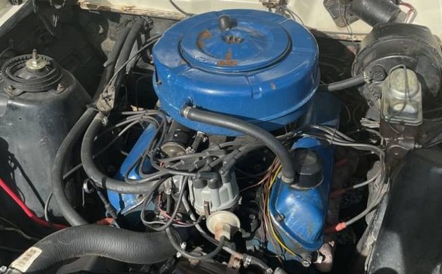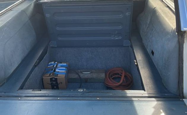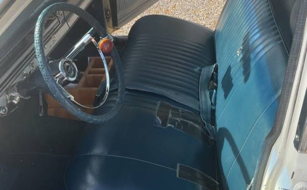 The blue vinyl upholstery, for the most part, is in OK shape, though the bottom rest of the driver’s side front seat has been patched with what looks like blue duct tape. This Fairlane’s recorded mileage is 90K, and the interior generally reflects that usage. The wayback is sound and doesn’t show signs of heavy hauling abuse, though the dash is wearing a toupee, so I’d assume a cracked dash pad. There’s no third seat in this Fairlane, so there’s a spacious storage area instead – a very functional feature. This is a non A/C equipped car.