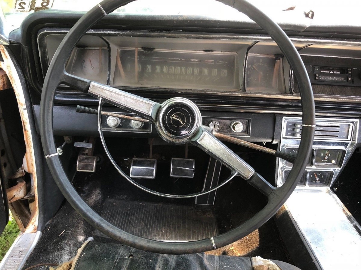 The interior appears to be complete including the hard-to-find and expensive-when-you-find-it center console. Check out those factory gauges mounted between the console and the dashboard! The passenger side door panel actually looks like it could be reused with a little cleaning. Can’t say that for any of the rest of the upholstery.
