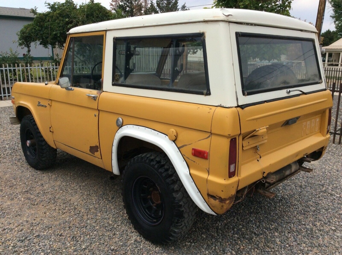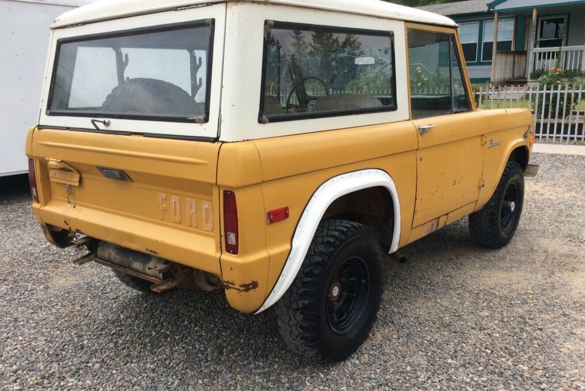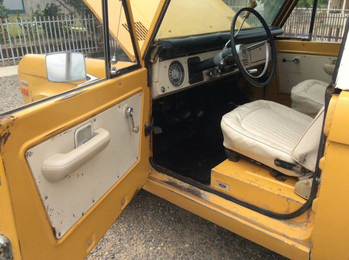 It seems almost inevitable that when we start looking at 1st Generation Broncos as project builds, the overarching issue that we need to discuss is the presence of rust. This Chrome Yellow example is no exception, but its problems are pretty minor compared to some of the vehicles that we see appearing on our desks here at Barn Finds. There is surface corrosion in various areas around this old Ford, but penetrating rust seems limited to the floors and the almost inevitable area around the front inner fenders. However, replacement steel for these areas is both easy to find and affordable. A complete front floor will cost under $500 to give you some insight, while a rear floor will lighten the wallet by a further $300. Throw in $130 per side for the inner fenders, and this Bronco could be returned to a rust-free state for under $1,100 plus labor. The panels look pretty straight, but the rear wheel arches have been cut to accommodate larger wheels and tires. Once again, shiny new steel is available to reverse this change if the buyer wishes, and this will add a further $65 per side to the tally. The rear bumper is missing, but the exterior appears to be complete. The glass is in good order, and the deeper we delve with the Bronco, the more it is looking like a relatively straightforward proposition for restoration.