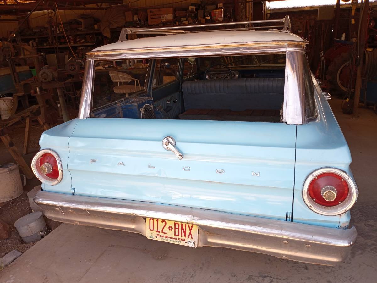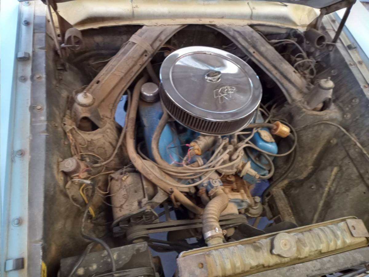 We don’t know how this wagon left the factory, but an inline-six with a column-shifted 3-speed manual would be likely. It looks as though the coupling where the shifter adjoined the steering column is still present. You could get a V8 in a ’64 Falcon, too, and that would have been a 260 cubic inch engine. We assume the 1968 or later engine is stock, but the presence of an aftermarket air cleaner suggests the goal was to make the car peppier than it would have otherwise been before.