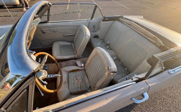 The Sahara Beige paint has seen better days and the same can be said for the standard Parchment interior. But the car has not escaped the rust bug and the driver’s side front fender may be an older replacement as the 289 V8 insignia looks as though it was ever there. The substitute motor runs well as does the 3-speed Cruise-O-Matic transmission. The electric doodads on the car work as they should, including the power top.