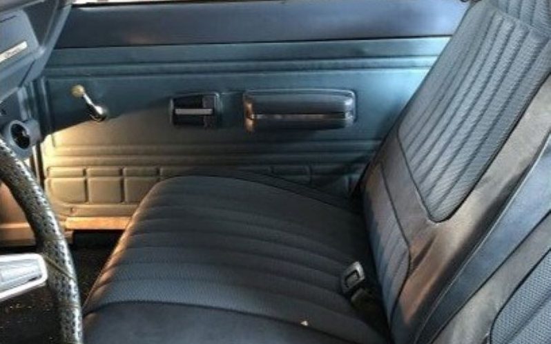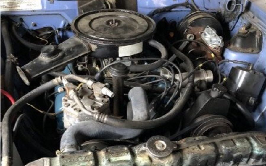 The interior is not revealed in a comprehensive manner, so a good look at it is not available via the accompanying images. It is a blue vinyl, bench seat environment and the seller claims the upholstery and carpet are newly installed and designed to match the original. Apparently, the radio and A/C-heat are “unresponsive” which I think means that they don’t work.