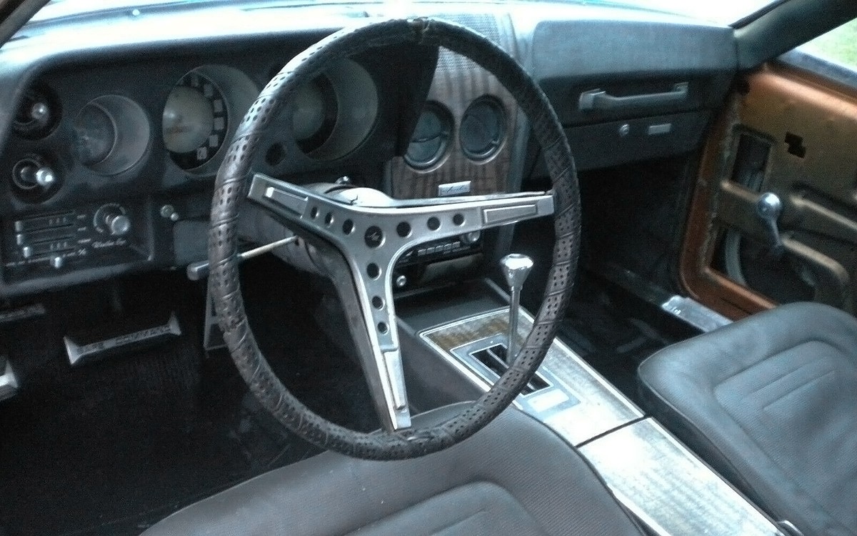 The charcoal vinyl interior is in nice condition other than the missing door panels. That’s unfortunate but maybe the next owner can track down a couple of them in a junkyard or online. This car has AC and you can see that everything looks like it’s in nice shape for being as old as the first moon landing. The back seat looks new. The driver’s side window is lying in the back seat, supposedly, as it fell off the track. I don’t see any rodent damage inside so I’m guessing that happened when they took it out of storage, not before it went into storage.