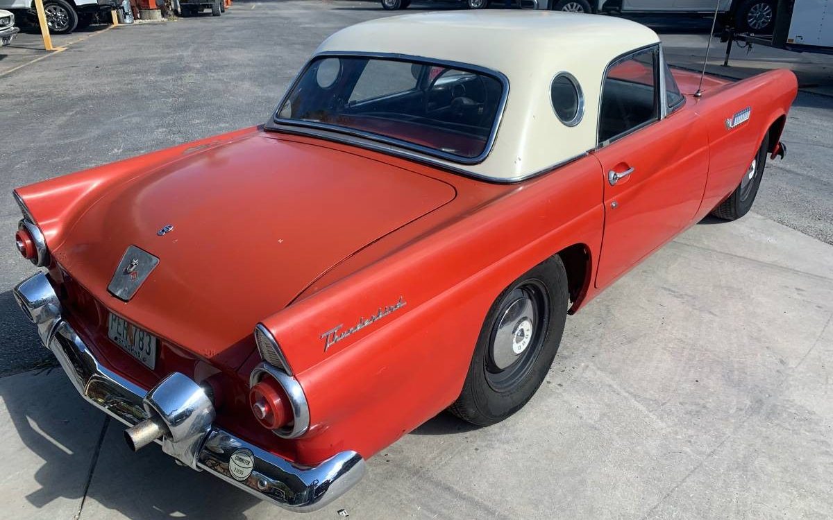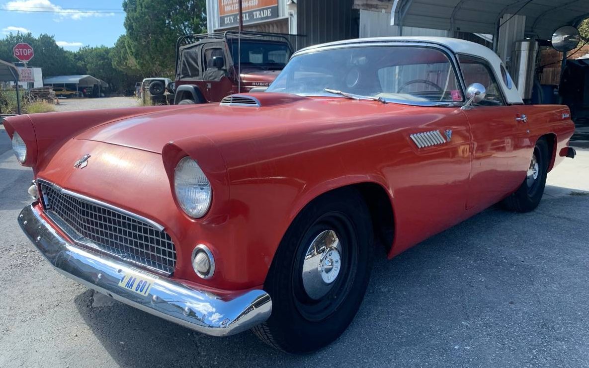 Somewhat subjectively, what I like about this T-Bird is its later 312 CI V8 engine, the lack of fender skirts, no continental spare (a standard on the ’56 but still found, added to ’55s), the three-speed manual gearbox (as opposed to an automatic), and the portholes – another 1956 styling cue. Add all of that to the “Torch Red” finish, faded as it is, over a straight body and you have a winner in my book.