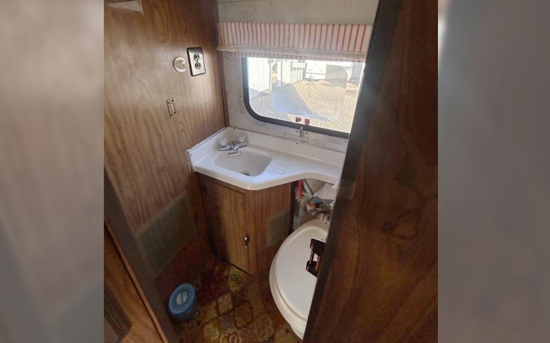 Here’s a partial view of the bathroom. They aren’t big, but anytime you aren’t running outside at night, in the cold, or in the rain, that’s a very good thing. The seller says this one is super clean (I agree!), it’s original, and has new tires and a new battery. At $8,750, this is 19 feet of fun for a very small price in 2025 dollars. Who has owned a vintage Winnebago motorhome like this D-19 Brave?