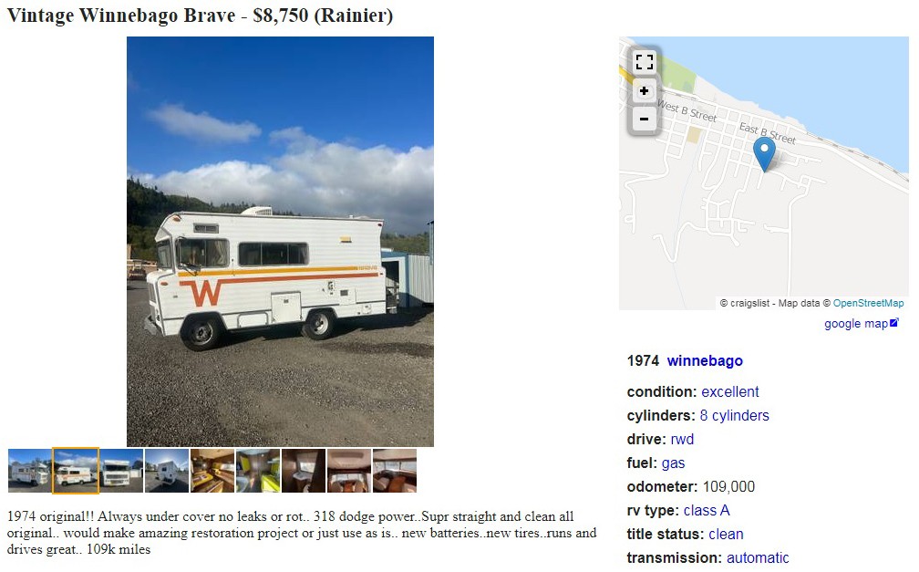 1974 was a big year in U.S. history. Who can forget President Nixon resigning? That was big. Sports news was also big, and very coincidental in the case of this 1974 Winnebago D-19 Brave. Hammerin’ Hank Aaron, playing for the Atlanta Braves, hit the pitch that broke Babe Ruth’s home run record. The seller has this nice example listed here on craigslist in Rainier, Oregon, and they’re asking $8,750. Here is the original listing, and thanks to Barney for the tip!