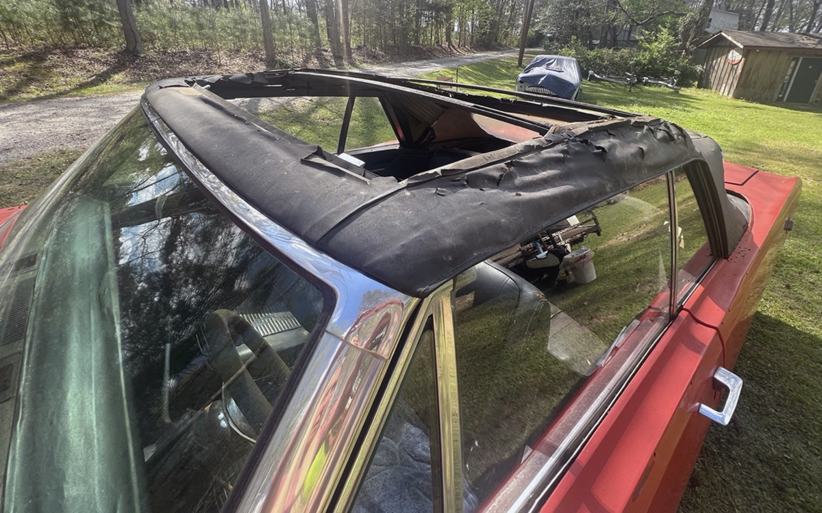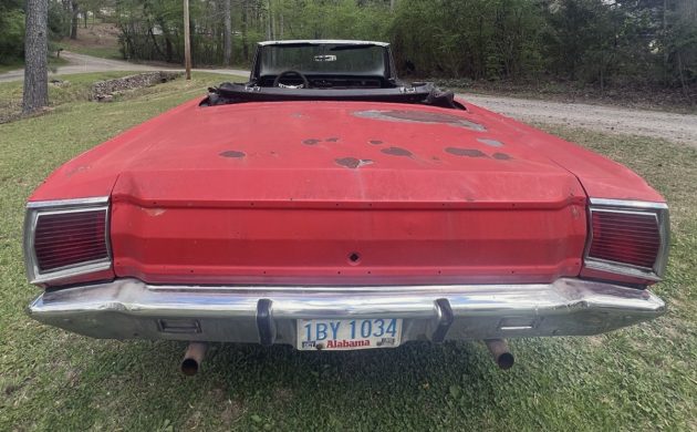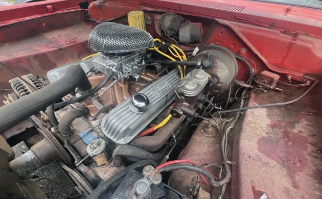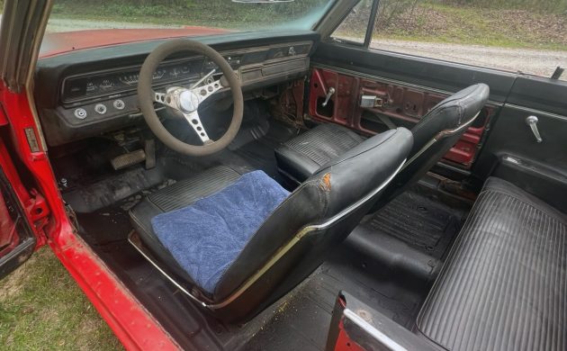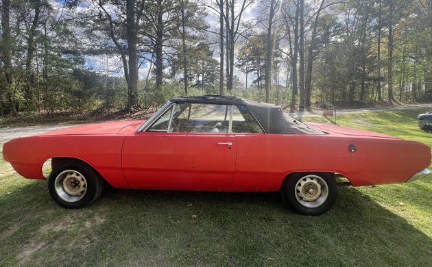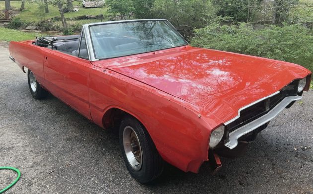 Here’s the 318-cu.in. OHV V8, although we don’t know the year it was installed or what its ratings would have been when it was new. The original engine (according to the VIN) was the top 273, a “high-performance” model with a four-barrel carb and 235 horsepower. The current 318 is said to have 360 heads, and you can see the high-rise intake and four-barrel carb. It’s backed by an automatic, presumably a TorqueFlite, which would have been a $147 option. They haven’t cleaned out the gas tank, so they’re running it on a couple of gas cans in the trunk, and there’s a pinhole leak in the radiator. Also, the brakes need work, but those things are pretty typical for a project vehicle. The dual-circuit master cylinder was new for ’67. Hagerty doesn’t list a value for a convertible, but they’re at $8,400 for a two-door sedan version in #4 fair condition, exactly what the seller is asking for this car. How much is this car worth as it sits now?