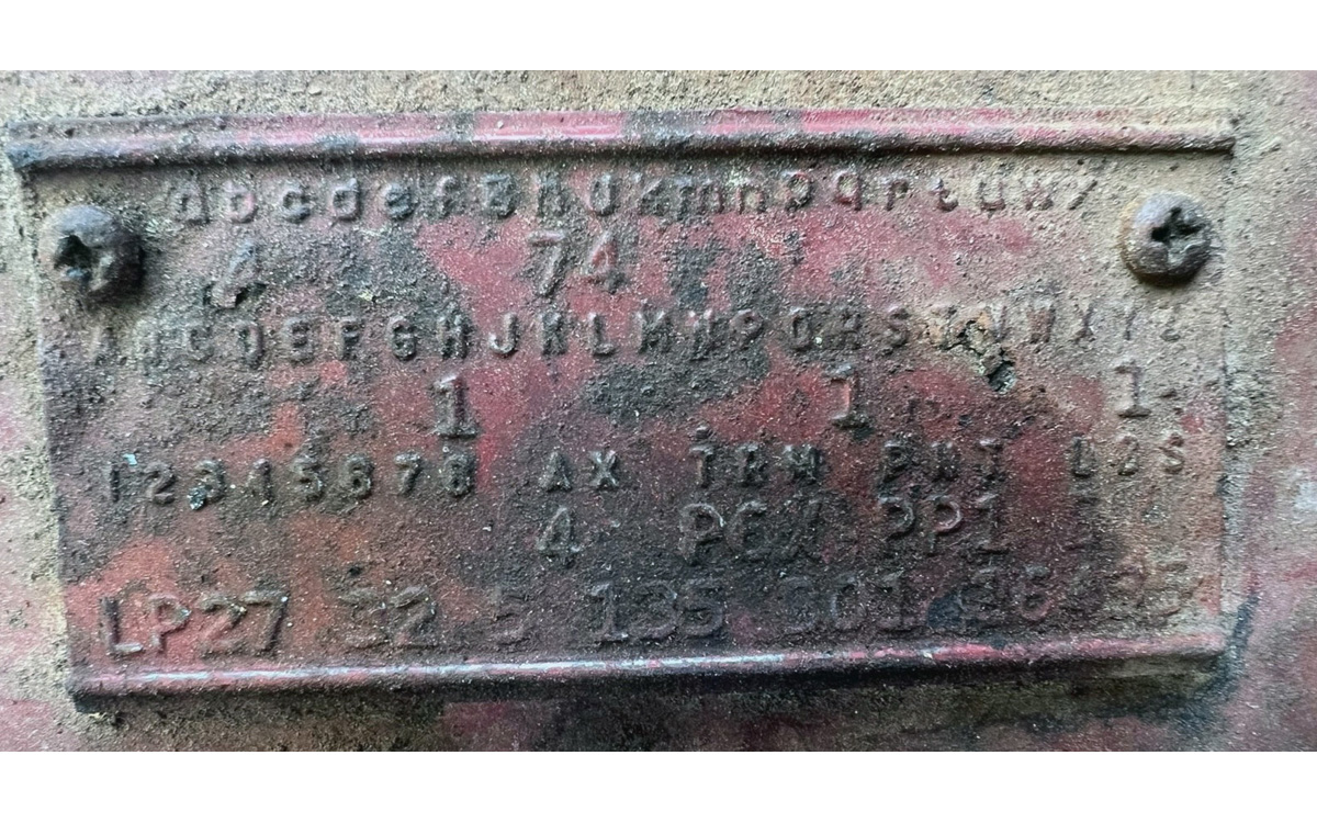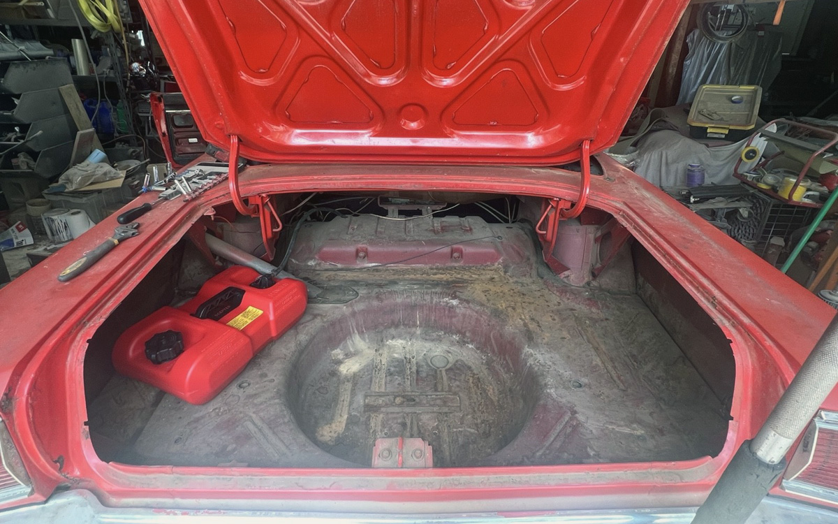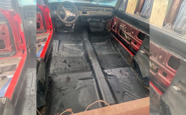 The seller knocks a grand slam by showing a photo with the seats removed so we can see the floor pans. In trying to decode the somewhat hard-to-read data plate, it appears that this car came with front bucket seats (the 4 under letter b), and a premium bucket seat interior in black, which is shown here. The rear end was a 3.23:1 without “sure grip,” the 4_ under AX on the date plate. No designation under X means no sure grip. The paint is PP1, which is Bright Red Metallic.