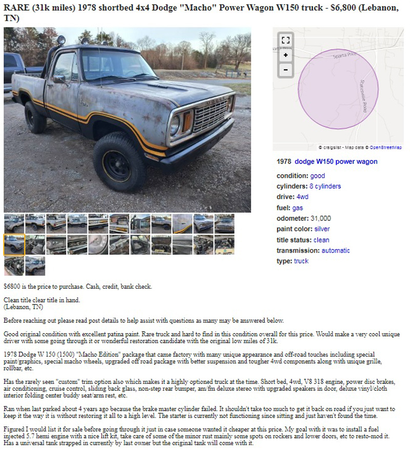 One person sees “patina,” and another sees old, faded paint and surface rust. Which camp are you in? I could leave it as is, or restore it to how it would have looked. I like both options. The seller has this 1978 Dodge Macho Power Wagon posted here on craigslist in the great city of Lebanon, Tennessee, and they’re asking $6,800. Here is the original listing, and thanks to Barney for the tough tip!