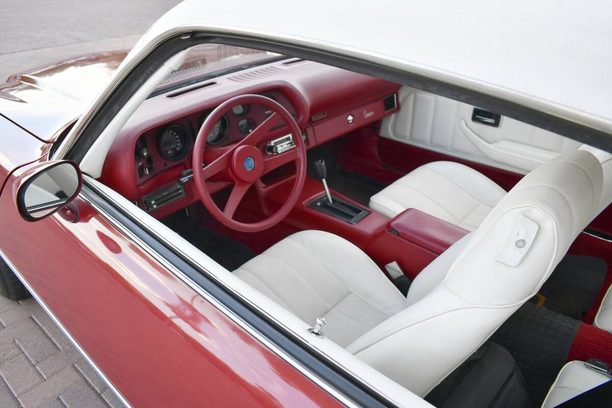 The car’s 350 cubic-inch V8 with a 4-barrel carburetor runs smoothly and the automatic transmission does its job properly. The Carmine Metallic Red paint presents quite well, though the seller says it’s not pristine due to a few little chips and the discoloration that sometimes comes with age. The white half vinyl top looks great as does the red and white matching/contrasting interior that looks ready for a road trip. This is a well-equipped automobile that may only lack factory air conditioning to wrap things up. We’re told this is a turn-key Camaro and it’s one of the nicest I’ve seen in a long time.