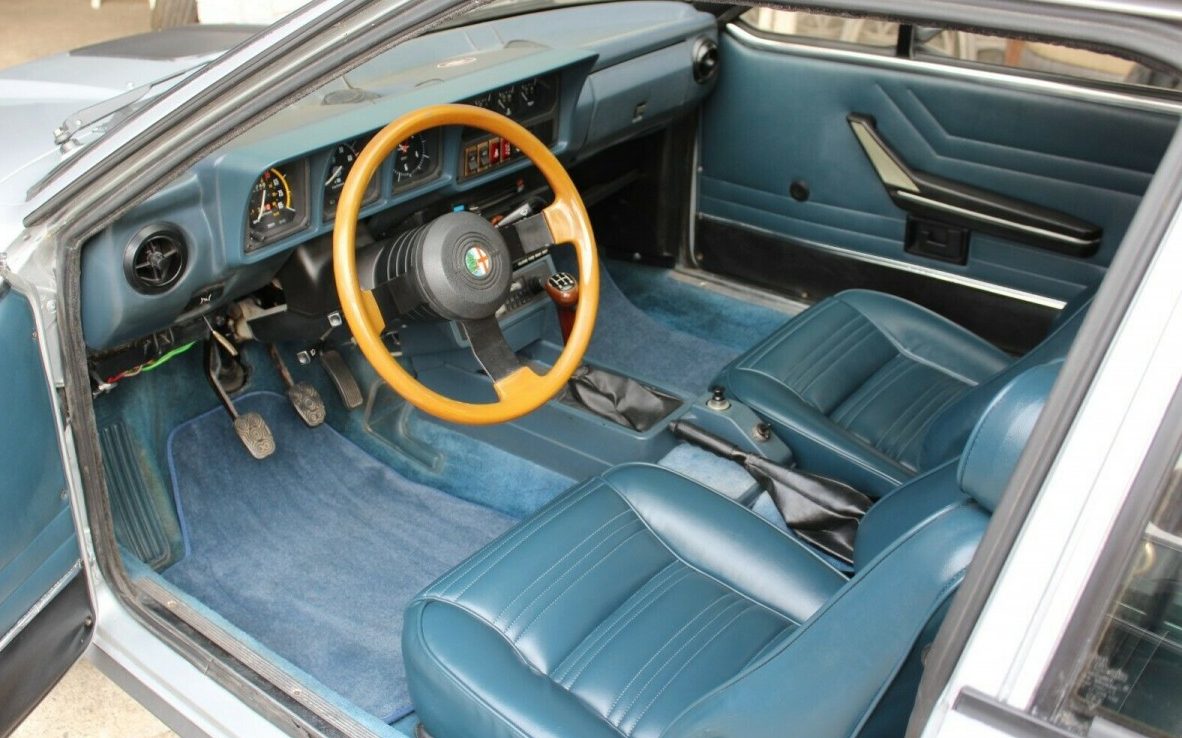The interior is in very nice condition! The blue leather seats have been reupholstered – again an unusual move for a car with such low mileage, but they combine well with the matching carpet and door cards. The wooden steering wheel is a standout IMHO. The only thing that appears to be out of place is the split dash pad. The seller mentions that the speedometer and tachometer needles get stuck, occasionally, and the needles supposedly need to be “straightened”. Also, the heater and A/C are not working. There is a new heater control valve included which may fix the heat problem but it is unlikely to revive the non-working A/C. Besides, if one has the replacement heater valve, why not install it? It’s a small-potatoes item compared to everything else that this Alfa has experienced.