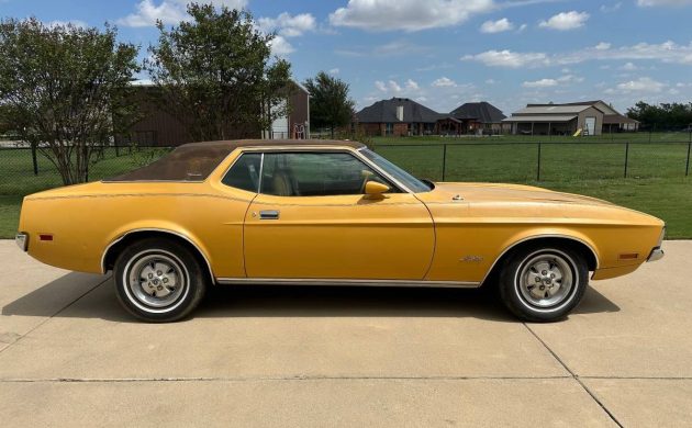 There is no denying that sales volumes for the First Generation Mustang were dropping continuously as the 1970s dawned. From the 1966 record of 607,568 vehicles, the figure dropped to 190,727 in 1970. Ford had attempted to stem the flow in 1969 by introducing the Grande version, and while volumes continued falling, the Grande offered buyers a more luxurious ownership experience. That variant remained available following the 1971 model refresh, with our feature car 1-of-18,045 Grandes ordered in 1972. The seller describes it as a survivor that was ordered in Medium Yellow Gold with a Brown vinyl top. The paint looks surprisingly good for a car that has spent its life under the Texas sun. It has flaws and imperfections, but the car’s lack of rust means that it could be left largely untouched if the new owner wished to preserve its survivor status. However, the vinyl has succumbed, and that is something that I would replace to eliminate a potential future rust trap. The trim looks acceptable for a survivor-grade vehicle, and there are no obvious issues with the tinted glass.