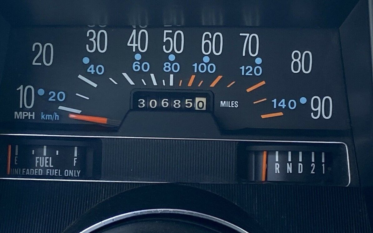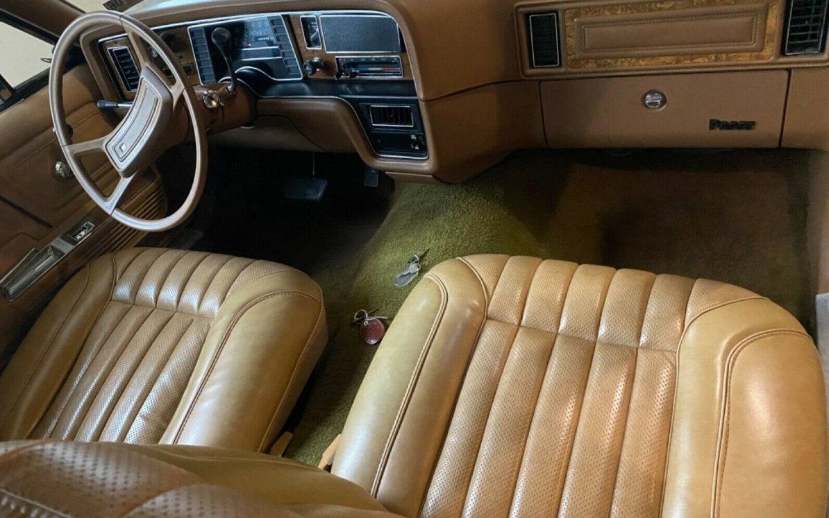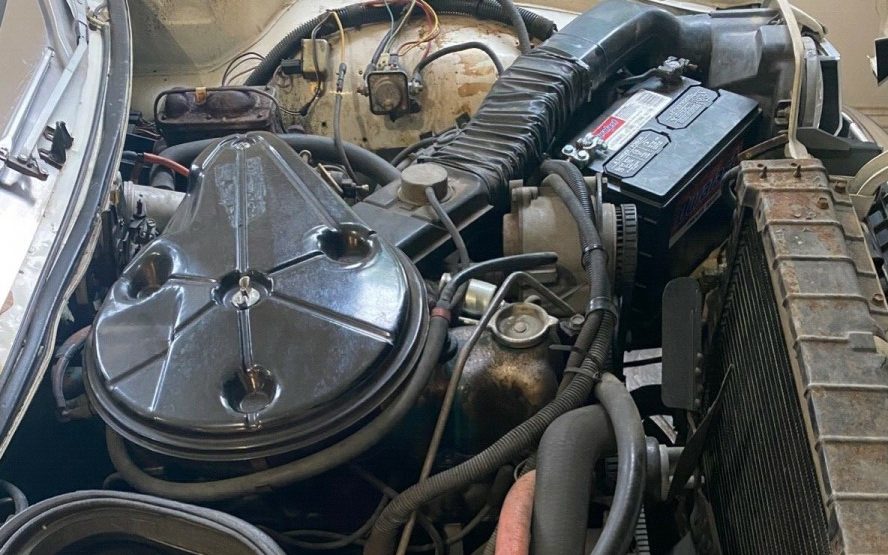 The tan vinyl upholstery shows about how you would expect that of a 31K mile car to show, one that has seen little use and has been properly stored. The seats, which actually look pretty comfortable and allow for a size comparison with a GM intermediate of the era, are showing no wear. Same with the dash pad and carpet though the carpet could have some not surprising fading going on, typical with age. Cheesy looking ’70s fake wood is in accented places on the dash and instrument panel, and yes, the original radio is where it should be. This is an A/C equipped car, no word if it is operable.