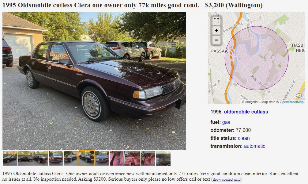 Another in the series of cars that were once everywhere but are now nowhere. I mean… they are rarely seen today. Dark Cherry Red Metallic is a beautiful color for this 1995 Oldsmobile Cutlass Ciera SL Series I sedan, and the seller has it posted here on craigslist in Wallington, New Jersey. They’re asking $3,200, here is the original listing, and thanks to Zen for the tip!