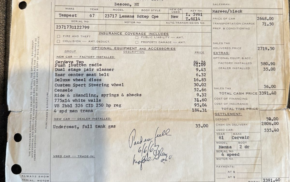 Before anyone says anything; I noticed it, too. Although the car may have made its way to Arizona early on, it was sold new at “Maple Glen Garage” in Fishkill, New York. I love original documentation; we can see that the original owner traded in a 1961 Corvair Monza Coupe (worth $535.50) on his new LeMans. Based on the options he ordered, he wanted a sporting car at a reasonable price: It has a four-speed and the “Ride & Handling” package (which cost a mere $9.32—why wouldn’t everyone order it?). It also has a console and a “Custom Sport Steering Wheel,” so it is a fun and economical piece of “not-quite-a-muscle-car” transportation.