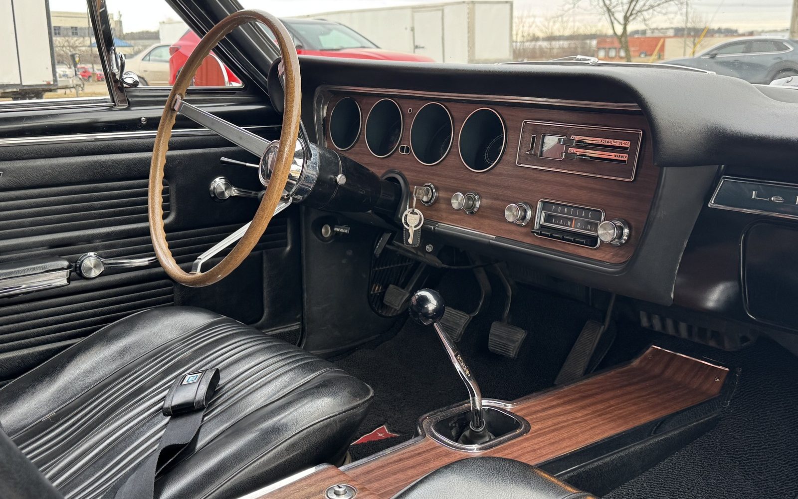 Then there’s the interior, which was almost always a high point in sporting Pontiacs. The fake wood looks almost real, the round gauge clusters are a country mile more exciting than the typical ribbon speedometer, and the wood wheel looks like it belongs on a British sports car. The seller says that everything is beautiful inside.