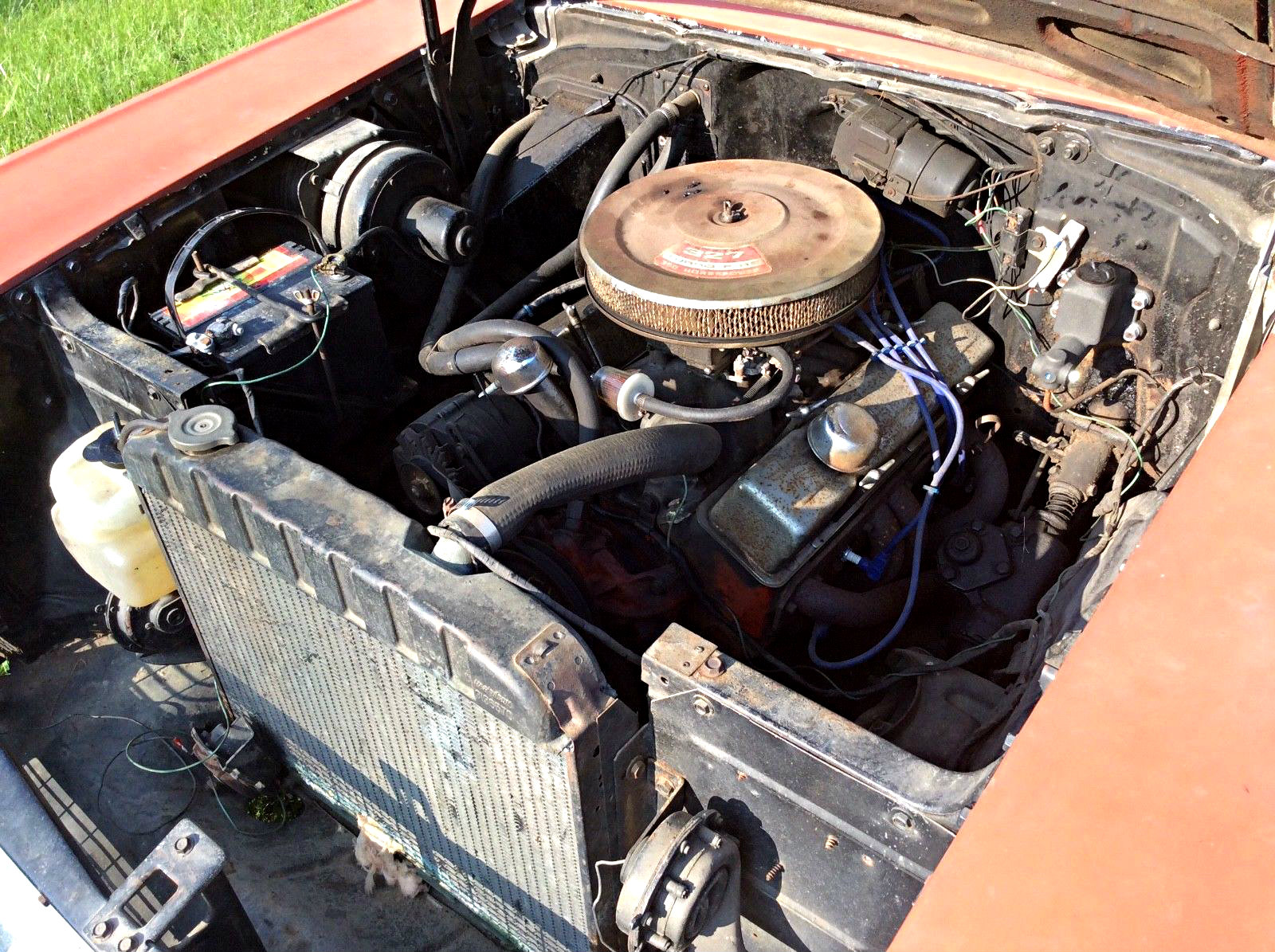 Huh. Six cylinder radiator. No difference from the V8 mind you, other than the straps put it on the outside of the core support. Funny how this stuff pops up after not seeing it for 30 or 40 years. be that as it may, and not being a Chevrolet kinda guy, this is a good combo as it sits with a ton of possibilities.