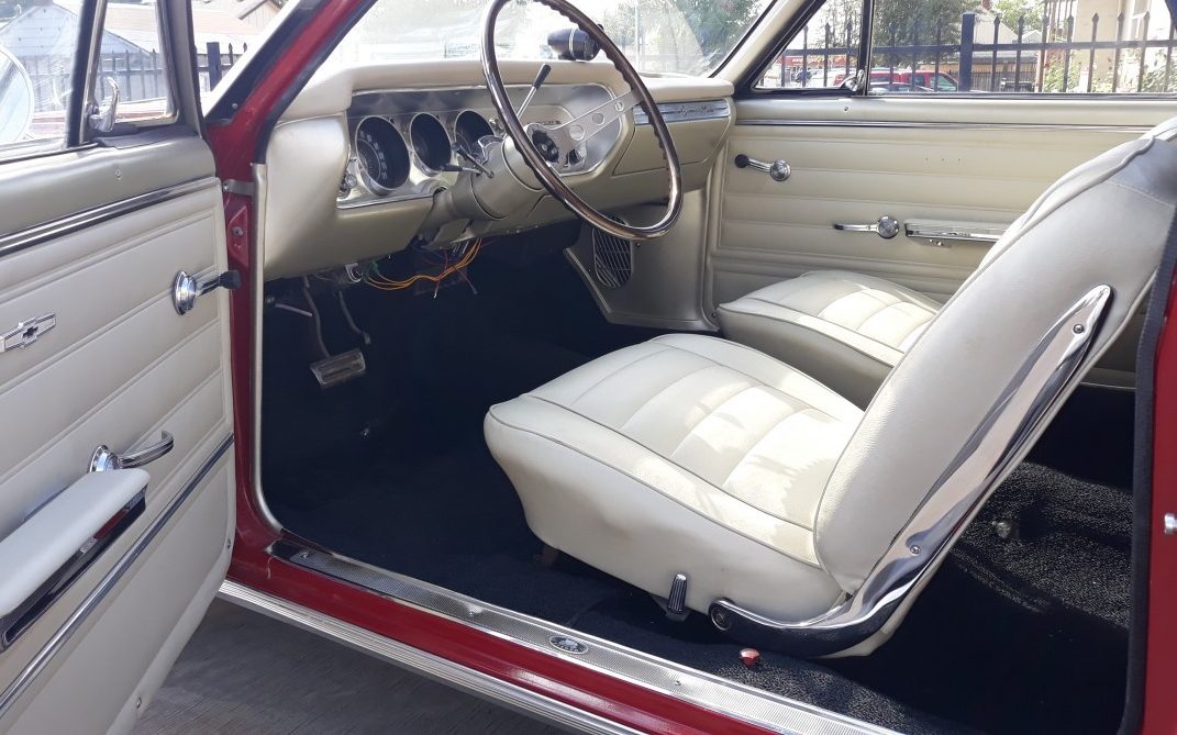 Outside, the old stands strong with the original Chevrolet sheet metal but the new is obvious with the resplendent Regal Red finish, complete polished chrome trim, and latter model rally wheels. The seller exclaims, “NO RUST!“, an easy-to-believe claim! The only noted issue is the lack of windshield wipers and the windshield reveals molding – those may be items worthy of an inquiry.
