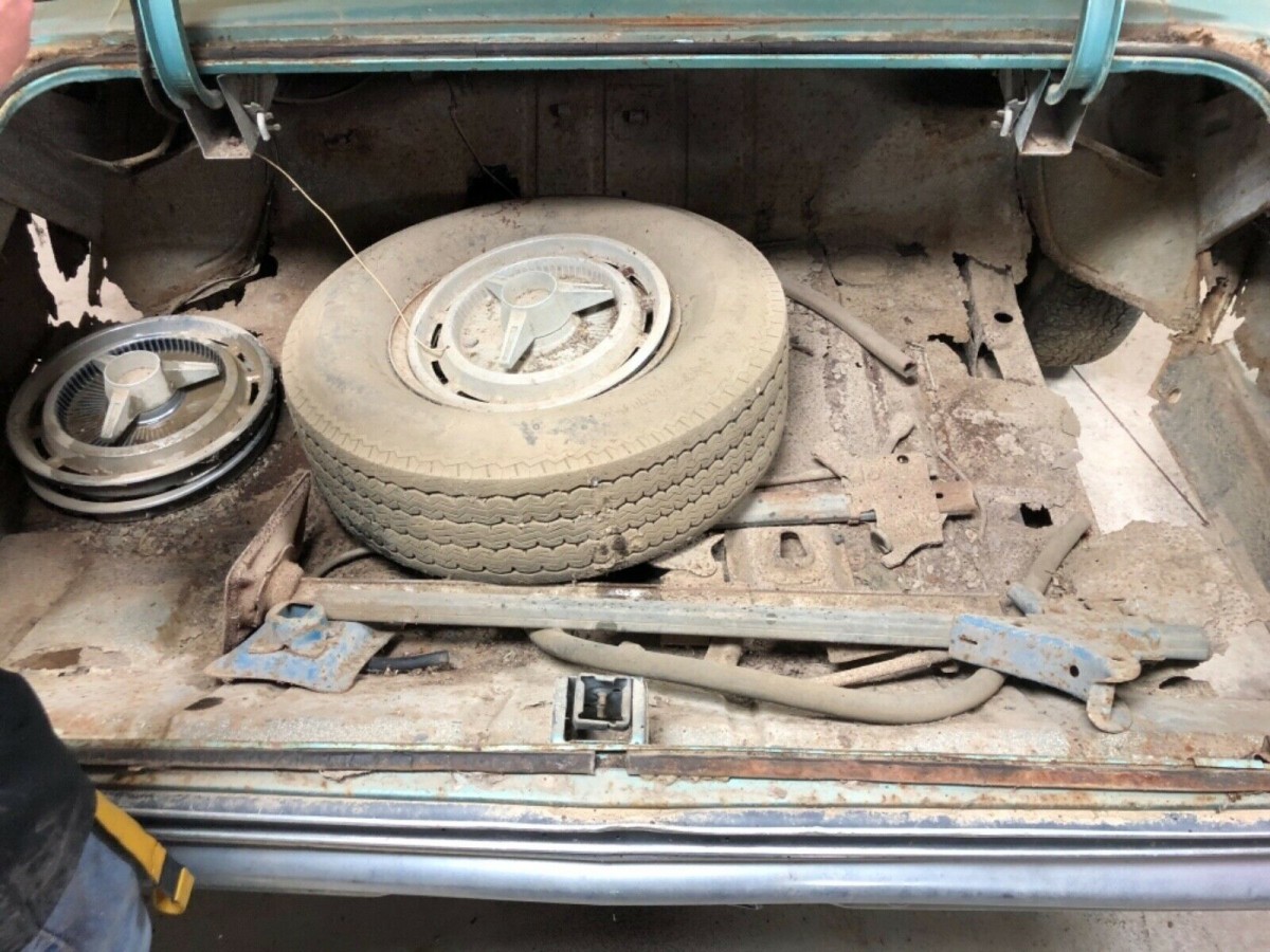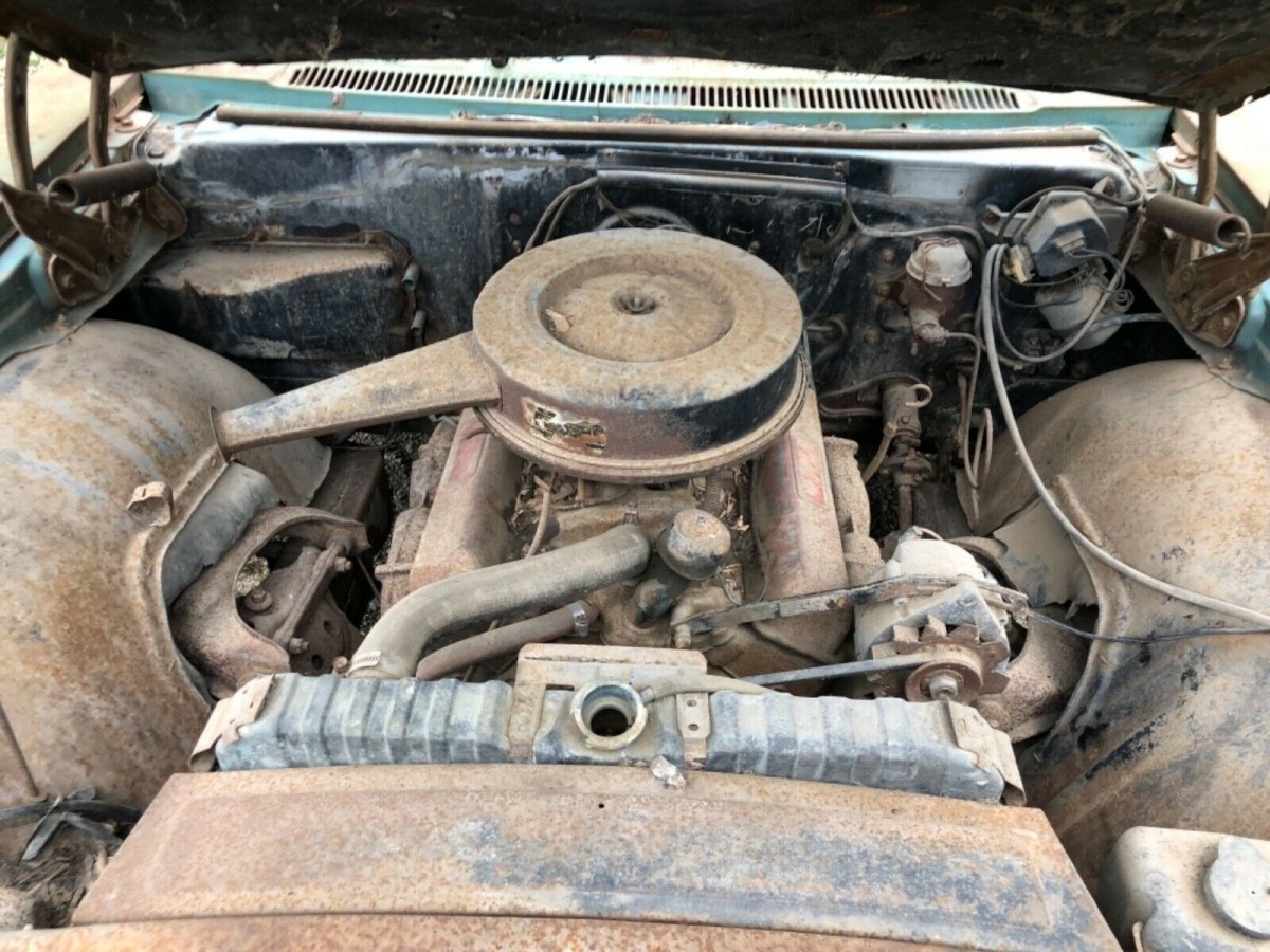 We’re looking at a car that will need a full restoration. It was turquoise in color when it was new, but the front clip has changed in color compared to the side body panels, so we wonder if the pieces were changed out at some point. Or it could simply be how the sheet metal was exposed to daylight or rain6 while under the roof of the barn it called home. The seller indicates that this Chevy will need a trunk pan, lower quarter panels, and likely the front fenders. But we’re told the floorboards are solid.