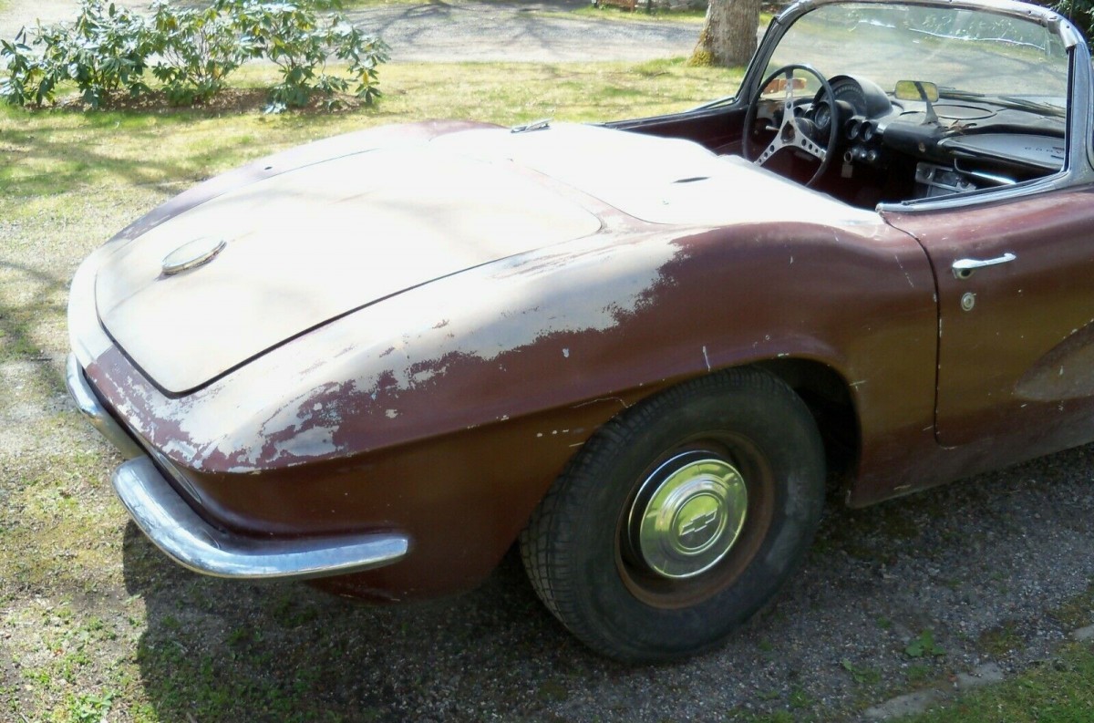 Five versions of the 283 cubic-inch V8 were available in the ’61 Corvette we don’t know which one of them was in this car originally. A 327 from a ’62 ‘Vette resides under the hood now, but it’s hooked up to the car’s original tranny and shifter, so at least that’s numbers-matching. The seller’s version is one of nearly 11,000 Corvettes to leave a Chevy manufacturing plant in 1961.