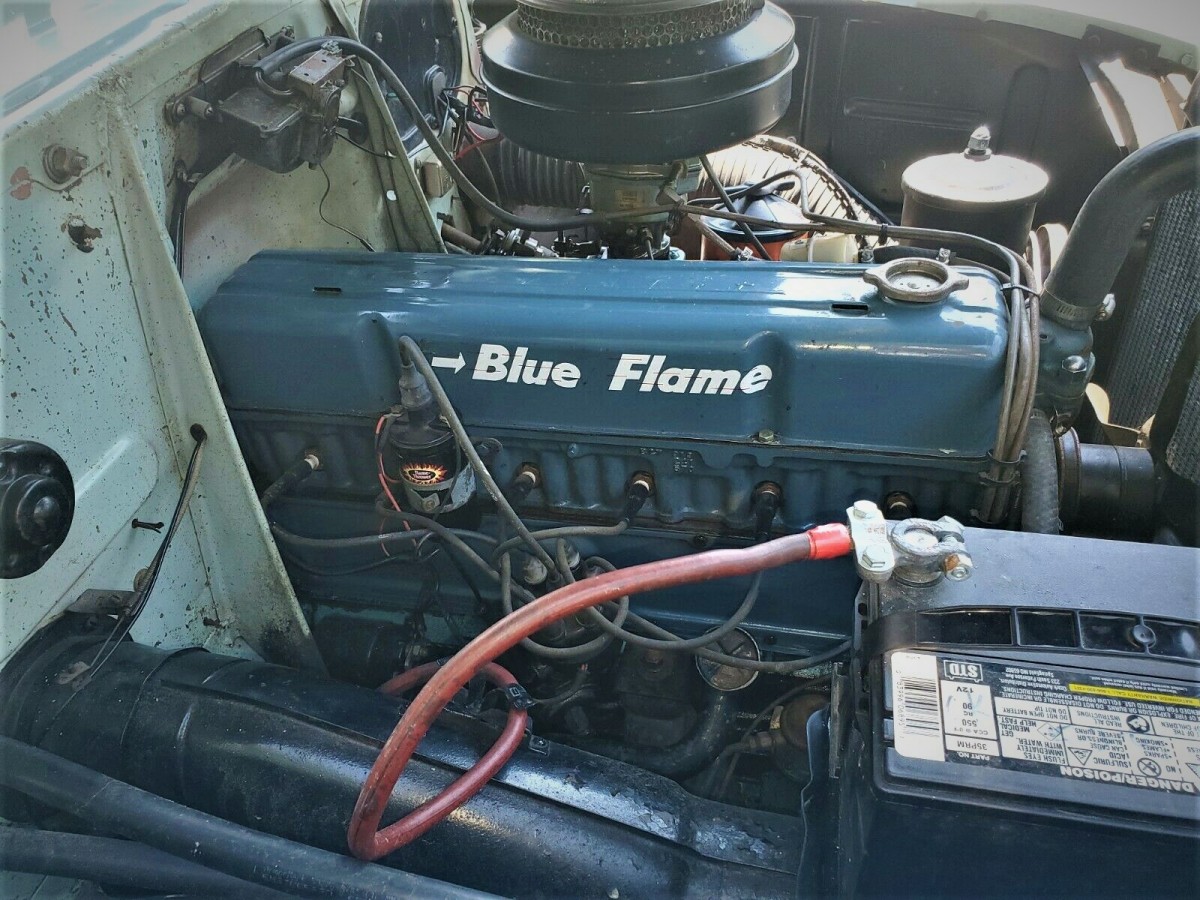We look now at the car up for bids, and it looks really nice. The seller tells us that quite a bit of engine work has been done, and that its Blue Flame six runs and drives. We can see a seemingly-original car that has been well-kept over the years, but not perfect. We’re told that over $6000 has been spent in fix-ups, and we can see a few of them in the engine compartment. Short of one small spot on the lower panels, we don’t notice any body rust, and there is a little something on top of the one fender, but overall, it presents well.