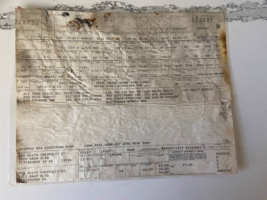 Window sticker is a repop (that’s OK). Shows vinyl trim as optional when the brochure shows it as standard on a convertible, and unlike the build sheet, leaves the “H” off the end of Pittsburgh. :)