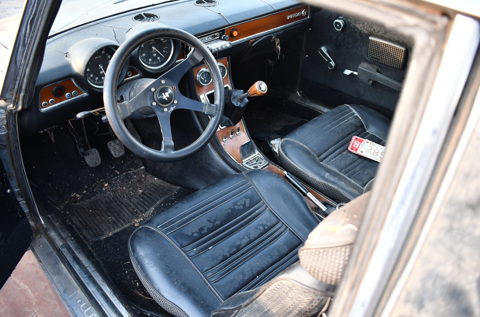 The seller doesn’t provide us much detail about the Alfa’s history, so that leaves plenty of space for my imagination to run wild. The seller notes that the barn had good ventilation, so the Alfa fared better than it may have in a damp or more dilapidated structure. The interior looks to be in very good shape with bucket seats in surprisingly good condition. The dash is, of course, cracked but the instruments are still clear and the wood trim in respectable shape, two good signs that the GTV was stored indoors for many years as the seller indicates.