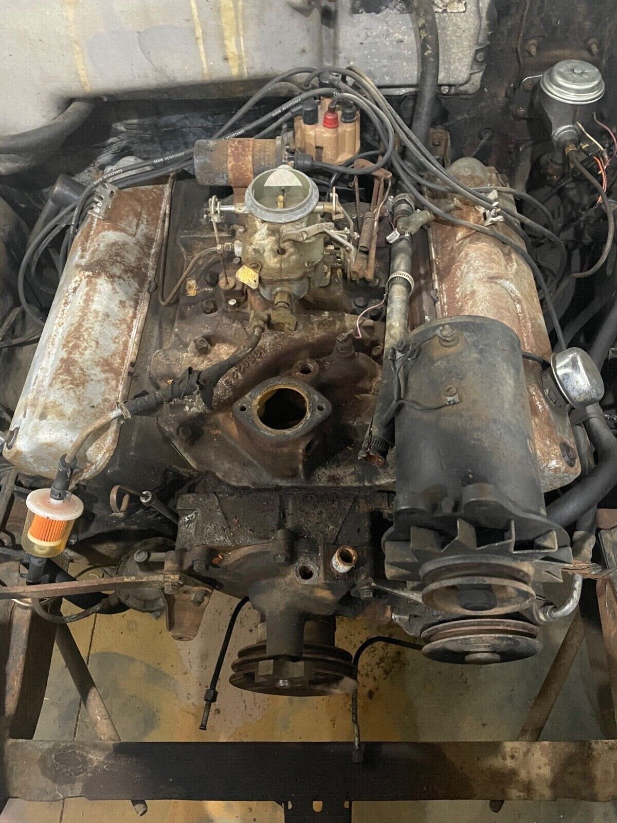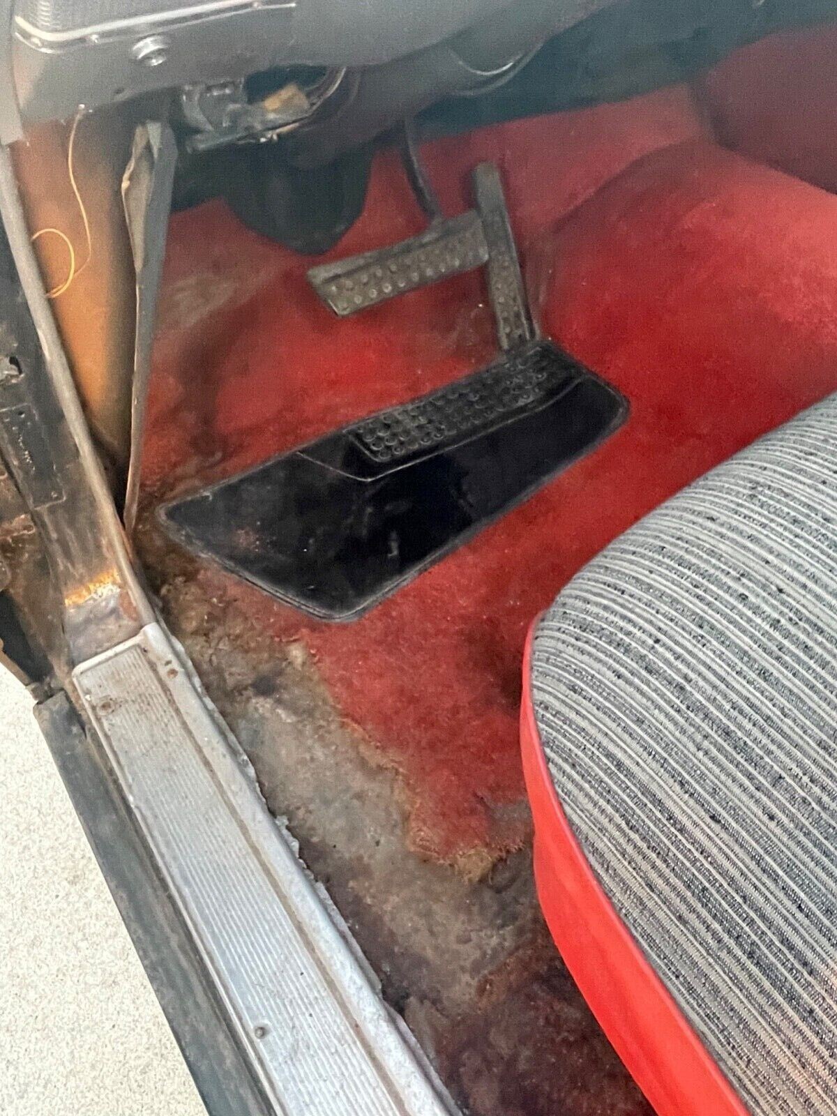 And daily driver is a good way to describe the machine as it will need body, paint, and interior work. Some prior patchwork has been done on the floors and rocker panels, and the brightwork in the front is a little bent and dented, but you may be able to pound it out. Inside the auto, the carpeting is worn down to the floors and the driver’s side of the front seat has some rips. But the headliner is good, and the dashboard may be fine after a good scrubbing.