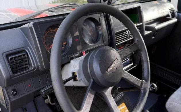 The interiors were cheap affairs, but functional. Even if you found a Samurai with some needs, it’s not entirely difficult to restore the interior. Fortunately, that’s not an issue here, as the brittle dash plastics remain in excellent condition and the steering wheel shows virtually no signs of wear. The seller does note that the stereo system has been updated, so it has one additional alteration beyond the larger rubber. The soft top is said to be in excellent shape and the seller claims there are no running issues, with the Samurai firing right up and running smooth. The one thing that’s missing in the description, however, is an accounting of recent maintenance.