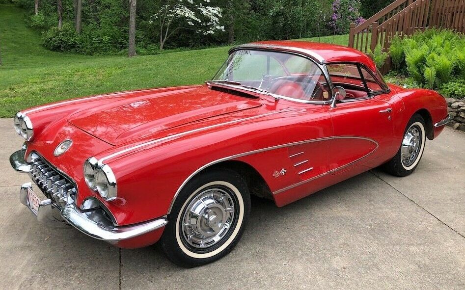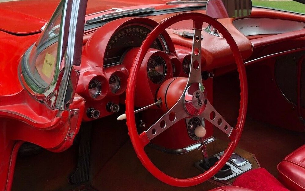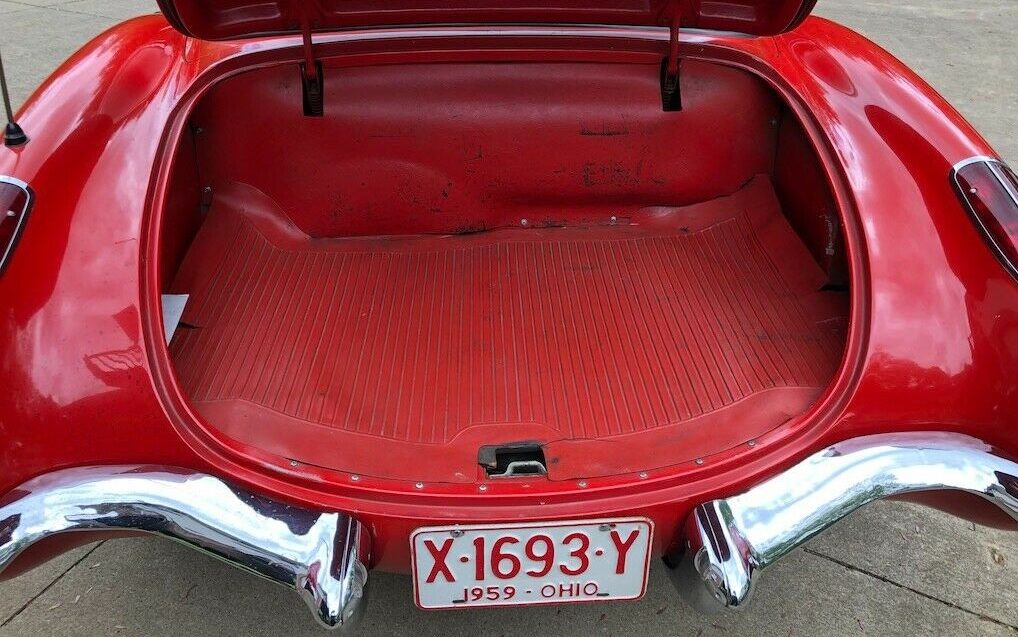 The present owner of this Corvette says he has had personal knowledge of this vehicle since the early 1960s and actually purchased it from the original owner’s family in 2016. The car had not been registered since 1974 and had been in storage until 2016. This Corvette is still wearing mostly its original paint, which appears to be Roman Red in color. The body is in overall really nice condition with just a few minor dings here and there and a crack under the exhaust exit on the driver’s side. The seller provided some photos of these areas and they appear to be only minor and cosmetic in nature, and probably not too difficult to repair if the next owner chooses to address them. Inside, the interior is also red also and from what we can see the dashboard, seats, and door panels seem to have survived well, although the carpet could use some attention. See that “T” shaped handle in the middle of the shifter? That was a first for 1959 to eliminate the driver from accidentally putting the transmission in reverse.
