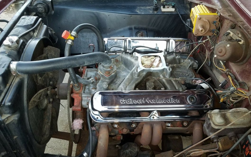 Mean little street machine, or at least it was. With that single plane intake manifold I’ll just assume it has more cam, compression, timing, the Direct Connection valve covers are just sitting on it, the yellow Accel coil. All of it right down to the cool wheels and t-handle shift knob are how I remember these machines.