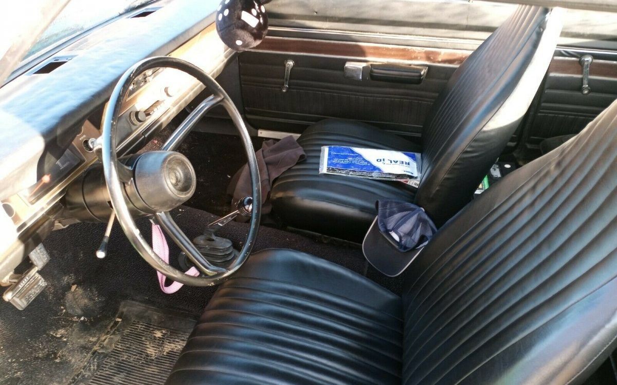 Many of these Dart retrofits end up with a 360 CI V8 planted under their hoods (blacked out or not) but the seller, in this case, stayed with a 340 which was the Demon’s performance engine for ’72. In this case, the original 318 CI V8 got the heave-ho and the current powerplant was boosted from a 1970 Mopar something or other and is now married to a four-speed manual transmission (said to “shift like butter” further connected to an 8.75″ differential. The whole enchilada “runs awesome” though the driveshaft has a vibration.
