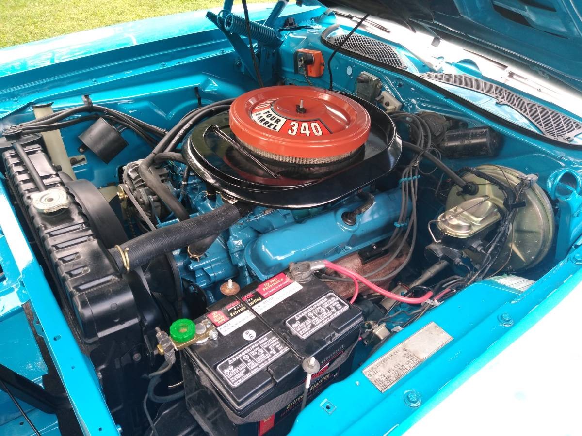 Never have seen an air grabber hood on top of a 340. Must be rare. Never liked the interiors of these, the buttoned down seats look tacky like some cheap Mexican tuck and roll job. The 340s of these years were okay engines, but I think the eventual 360 was better, had more pull. The 340 was best high winding, and with smog control, didn’t do that so well. The 360 was a better highway cruiser as well. Plus, the small blocks made them handle better when you hit a curve.