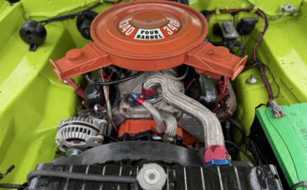 This car decodes as having been assembled with a 318 cubic inch V8 and a TorqueFlite automatic transmission. And we believe the color of exterior paint was something less dramatic than the Sublime Green today. The car’s odometer is close to turning 100,000 miles, without mentioning when the restoration/transformation here took place. But it looks like it was well done with attention paid to detail. A 4-speed manual transmission was a part of the changes made.