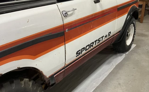 The Sportstar required the buyer to order a “Winter White Traveltop” with a T-407 automatic (which was a 727 Torqueflite), a “sport steering wheel,” the “off-road tire package,” and a black custom interior, although (like this example), “several have been seen with Russet Plaid interiors.” Then, the Scout IIs were given these special graphics. Unfortunately, the seller of this example didn’t pull it out of the garage for pictures, but you can see that there’s some rust in the wheelwells and lower quarters on this side. The missing door trim will come with the sale.