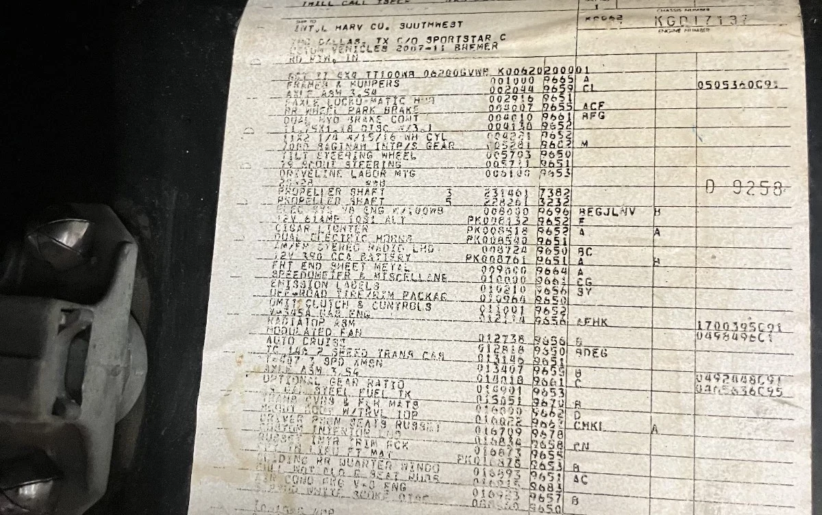 A nice thing about buying a Scout is that production records are readily available. This one has its “Line Setting Ticket,” which shows almost every piece of equipment installed on the truck at the Fort Wayne assembly plant. This one is fundamentally loaded; it appears to even have a tilt wheel and “auto cruise.”