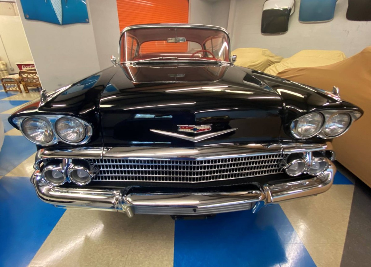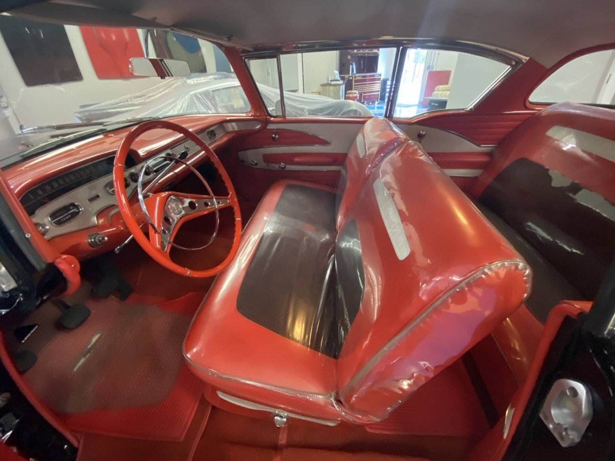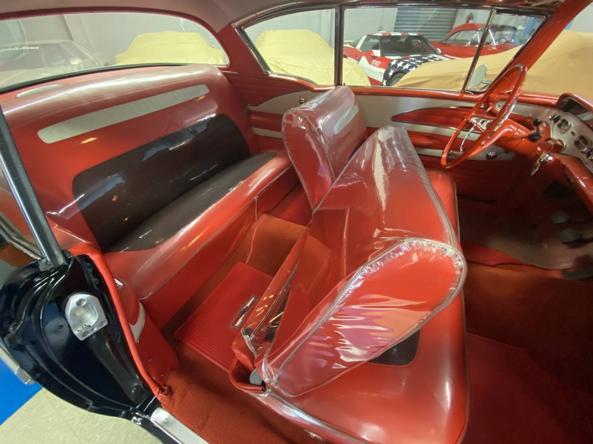 Skirts were NOT a factory option on Chevys from 55 to 1967. These are aftermarket. The main problem with this car is that it’s a ‘made up’ car. There was NO RED INTERIOR for a 58 BA, only on an Impala. However, it is done in the correct BA design, except for the Impala wheel. This one has a rear antenna installed about 12-16″ too far forward. In 58, the antenna went at the back of the quarter, not in the middle. A black car would’ve had a gray interior. Too many ‘owner’s choice’ mods IMHO.