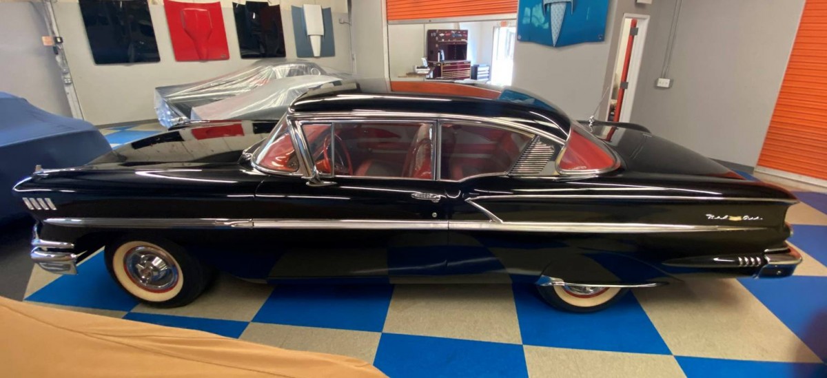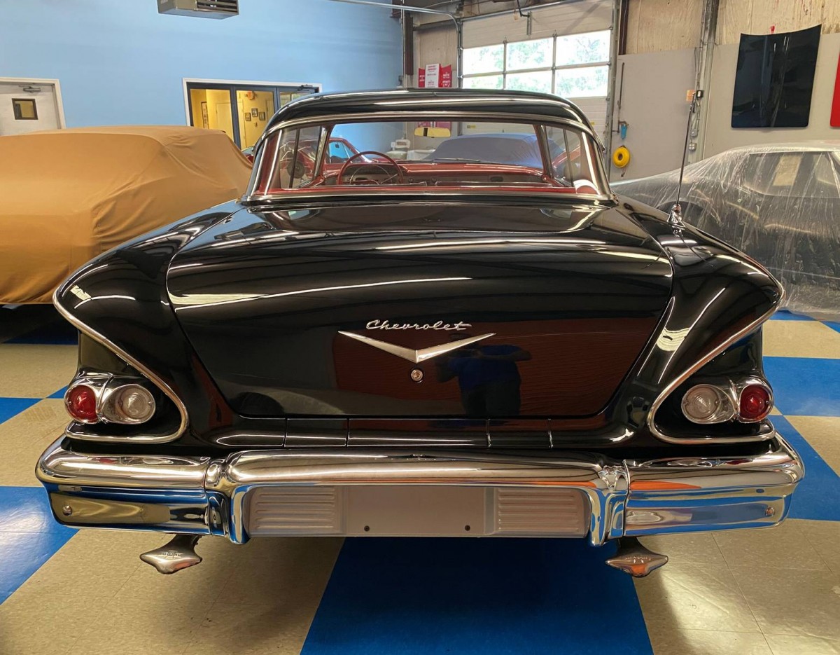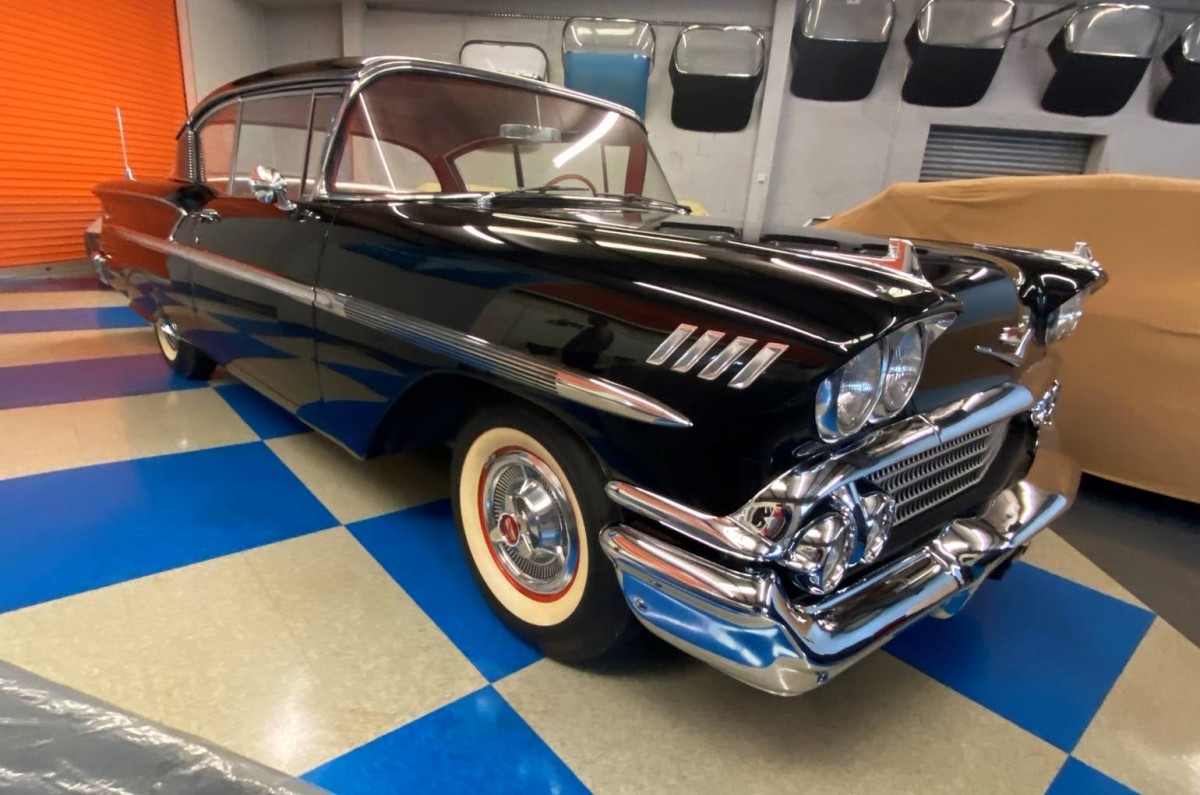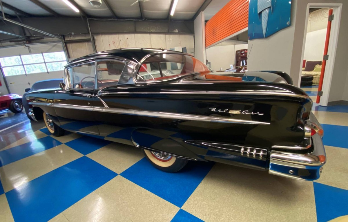 Skirts were NOT a factory option on Chevys from 55 to 1967. These are aftermarket. The main problem with this car is that it’s a ‘made up’ car. There was NO RED INTERIOR for a 58 BA, only on an Impala. However, it is done in the correct BA design, except for the Impala wheel. This one has a rear antenna installed about 12-16″ too far forward. In 58, the antenna went at the back of the quarter, not in the middle. A black car would’ve had a gray interior. Too many ‘owner’s choice’ mods IMHO.