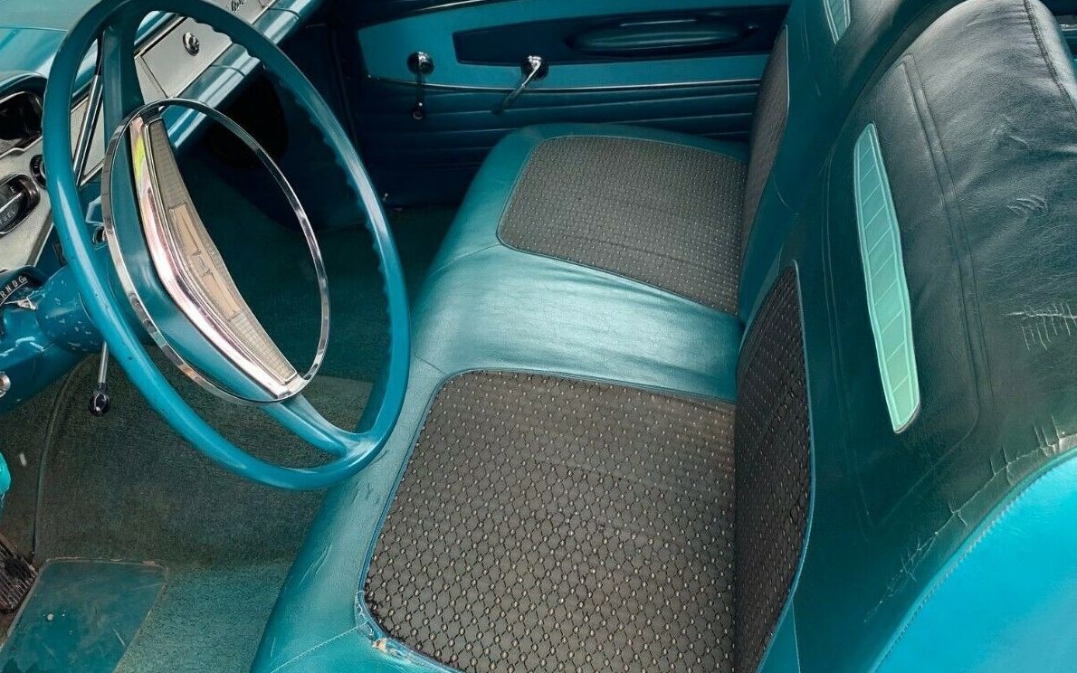 The interior of this hardtop is about how one would expect a 63-year-old original interior to look. The seller mentions a small tear in the driver’s seat, and it’s there – a seam separation, but beyond that, it shows OK. The driver’s side carpet is worn through, and seeing that, reminds me of a ’58 Chevrolet Brookwood station wagon that we had in my household long, long ago. I guess a Brookwood lines up with the Biscayne trim level as our wagon had a blue rubber mat, no carpeting anywhere in that car. When the driver’s side backseat footwell started to drop out, I found watching the torn mat swinging in the breeze, through the jagged floor opening, to be mesmerizing – the faster you went, the more it flapped.