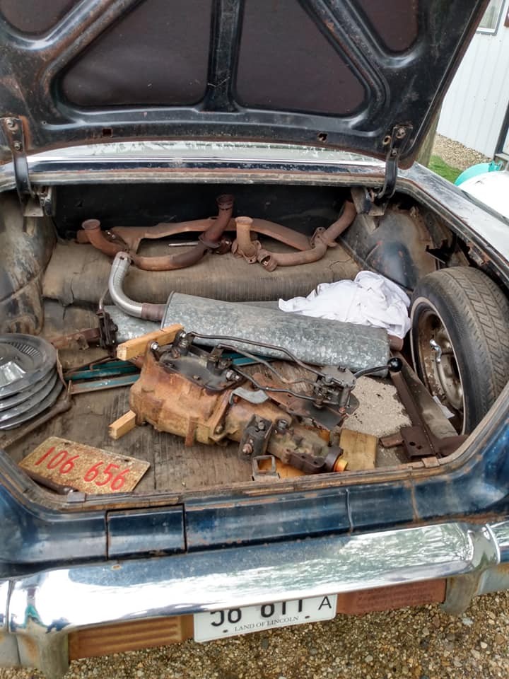 We’re told that everything connected with this car stills works, but the body is far from perfect with evidence of rust on the sheet metal as well as the front bumper. Our views of the exterior of the car are limited, so it’s hard to tell how much work will need to be done once everything is sanded down. There are no photos provided of the interior, and the trunk might have some rust in it, and it looks to contain quite a few parts, including an extra transmission, this one a 4-speed manual.